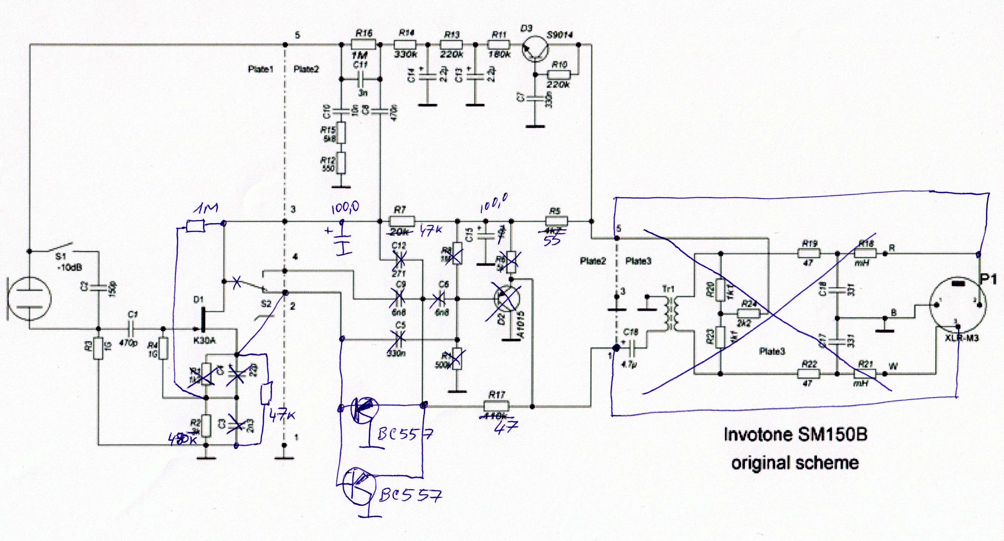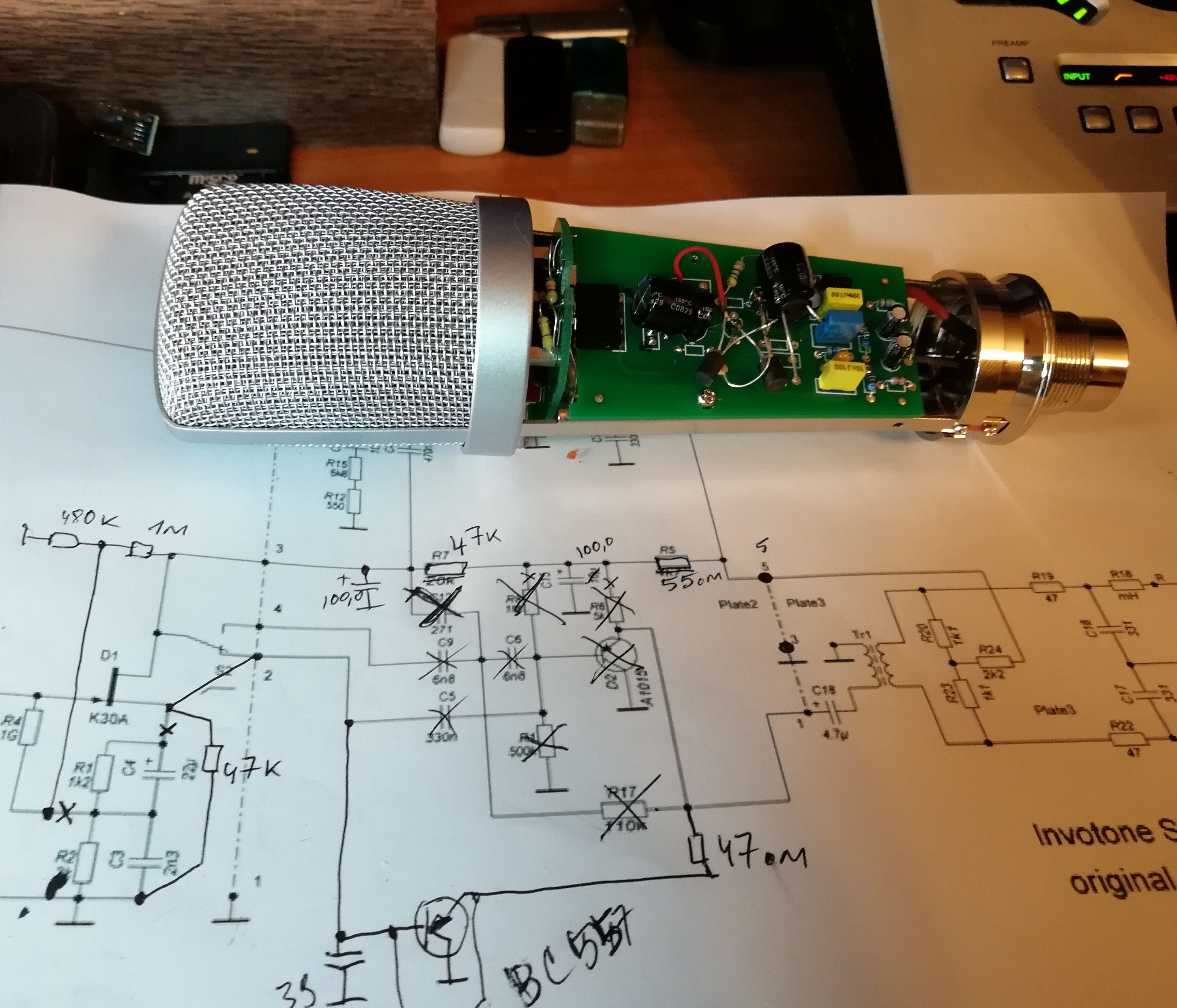 У меня в схеме два параллельных BC557-х, но и с одним картинка по шумам была примерно такая же. Инструментально точно не измерял. Конденсатор 39 пф не ставил. Выходную плату с трансом я просто удалил, но забыл отметить на рисунке, к сожалению. Утром скину нормальную схему переделки.