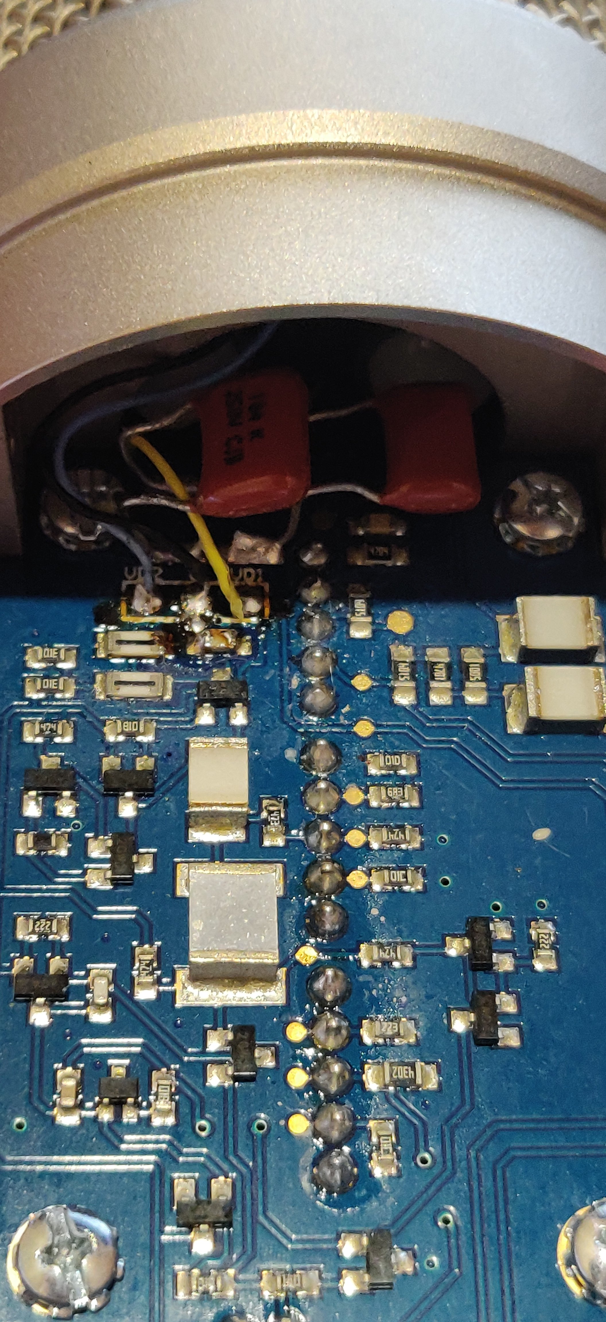 Всем доброго вечера! Случилась неожиданно беда... Ну беды редко случаются ожидано. Один из моих микрофонов, а именно Rode NT2-A стал чудить. После 3х лет использования появился шум (похожий на шум ветра) и треск. Я вычитал на нескольких форумах, что были люди с такой же проблемой и дабы ее вылечить, меняли 2 смд кондера, которые расположены над тремя проводками идущими к капсюлю. Найти именно такие же смд на замену найти я не смог в своем городе, нашел только вот такие, как на первом фото (0.1 мкФ 250в). В городе у нас только один мастер согласился взяться за ремонт микрофона. Заменили кондеры, оригинальные смд сломались при выпайке, т.к. мастер выпаявал паяльником, а не феном. При первом включении всё было норм, никаких шумов. Но через день все возобновилось. Фото того, что получилось, прикрепляю к посту. Может надо было убрать канифоль после пайки с платы? Странно, что мастер не убрал. Рядом с проводками на капсюль видно, что немного зацепили паяльником два кондера, либо это от канифоли так кажется? Я не шарю в радиотехнике. Кондеры, которые меняли, были подсевшие. Такчто по идеи поменяли их не зря. Вопрос в том на нормальные ли поменяли.... Может нужно ещё поменять те, что справа с края такие же два смд, как были те, что заменили? Что посоветуете? Может, кто сталкивался с такой проблемой и я лучше вам отправлю почтой на ремонт? А то, микро не дешёвый и я очень переживаю, как бы его не доломали до конца. Кстати, после того, как заменили два кондера, перестала работать восьмерка. Она работает теперь только при -10 дБ. До этого работала норм. Может это из-за канифоли на месте пайки? Или таки из-за того, что зацепили другие два маленьких кондера рядом с проводами снизу... Я весь на нервяках уже с этим микрофоном... Буду безумно благодарен за любые советы и помощь. Очень хочу вернуть микро к жизни.