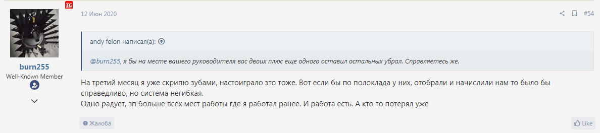 И все эти крики преувеличенны. Посмотрите его историю сообщений. Еще 12 июня у него с работой было все ок, и был доволен з/п, а теперь работа вдруг почти кончилась.