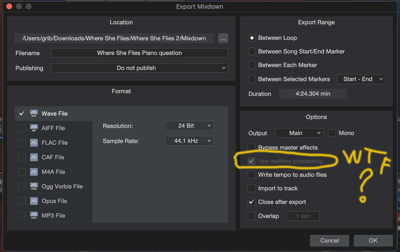 Поэкспериментируйте с галочками в этом окне. Возможно что-то противоречит реалтайм миксдауну..