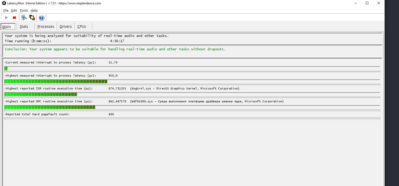 Очень нужна помощь! Может кто то порекомендует спеца (или возьмётся сам, что ещё лучше), который может настроить Latency в моём ноутбуке?? Уже готов практически любые деньги отдать- десять, двадцать тысяч, не вопрос-лишь бы был результат.. Купил себе на 50-летие новый ноут Acer Predator PH18-71. Дорогущую машинку, напихал в неё дисков и оперативки под завязку- всё летает и рендрится самолётом, только, почему то с ASIO полный швах! Щелчки на буферах менее 10мс. Симптомы один в один такие же, как и у автора этой темы.. Есть ещё два ноутбука-пятнадцатилетний ASUS и MSI посвежее- так на них на той же звуковухе RME бэбифейс про на минимальном буфере 48 семлов всё идеально! А здесь с таким распоследним железом-проблемы.. Обидно до соплей-отдать почти триста штук, и получить на юбилей неприменимый в живой работе аппарат.. Обращался к местным "гражданским" мастерам настройщикам- так они не могут понять, что требуется- там только про разгон фпс в играх, со звуком дела не имеют... Правда, не знаю уже к кому с этой проблемой пойти!! Я сам в Москве, но, как понимаю, это можно дистанционно всё настроить- соответственно по РФ могу оплатить на карту.. Помогите, пожалуйста!! Все темы про оптимизацию на форуме уже выучил наизусть, перепробовал всё что можно, но я не компьютерщик, мог что то не так сделать-мне привычнее к профильному специалисту обратиться.. Отчёты Latency Mon и все предпринятые уже шаги напишу во втором посте, слишком длинно получится..