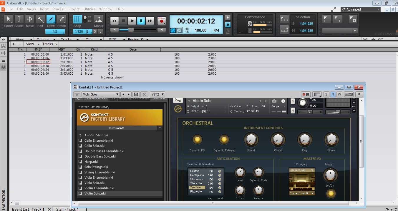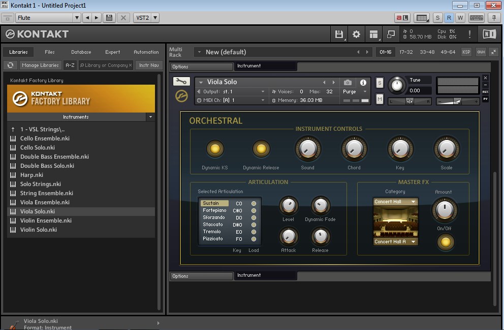 Инструмент Violin Solo. Написаны артикуляции и возле них номера клавиш, которые за них отвечают. C0 - сустейн, D#0 - стаккато, F0 - пиццикато. Нажимаете C0 - звучит сустейн. Жмёте D#0 - стаккато.