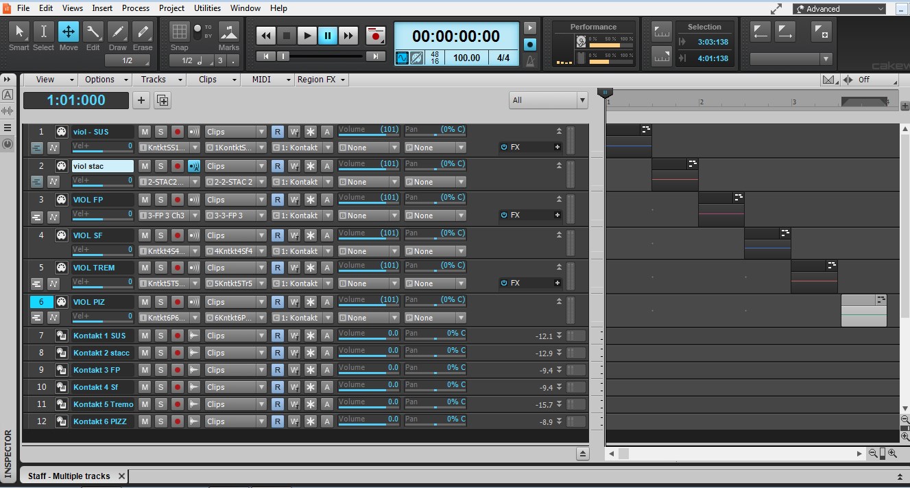 То есть один канал - для сустэйн, один - для Fortepiano, один - для стаккато, один - для тремоло, один - для пициикато, один - для сфорцандо. Итого задействовано 6 каналов. Это - для виолончели. Ещё 6 каналов - для альта. А для скрипки уже каналов не хватает. Как же записать для квартета?Загрузить соответствующие патчи в Контакт и назначить разные каналы на ноты.