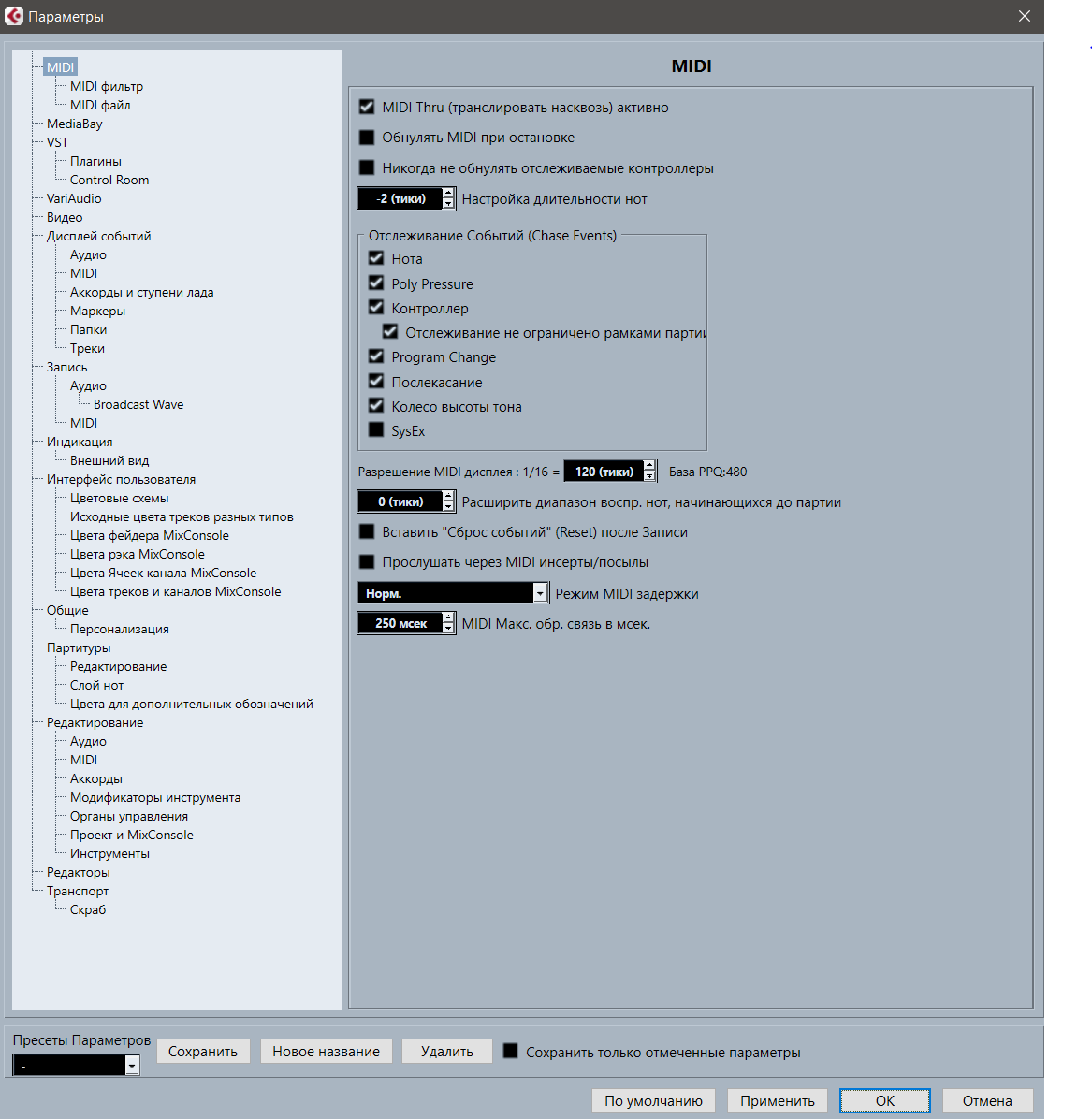 Доброго всем дня. Купил лицензию на куб.11.0.41 Build 448 но какой то вроде баг....не полностью показываются настройки параметров....(правка\параметры) начинаются с \\ MIDI - Midi фильтр - Midi файл \\ MediaBay.........нет того,что должно быть в списке выше....что за байда,где копать ? Может кто подскажет...