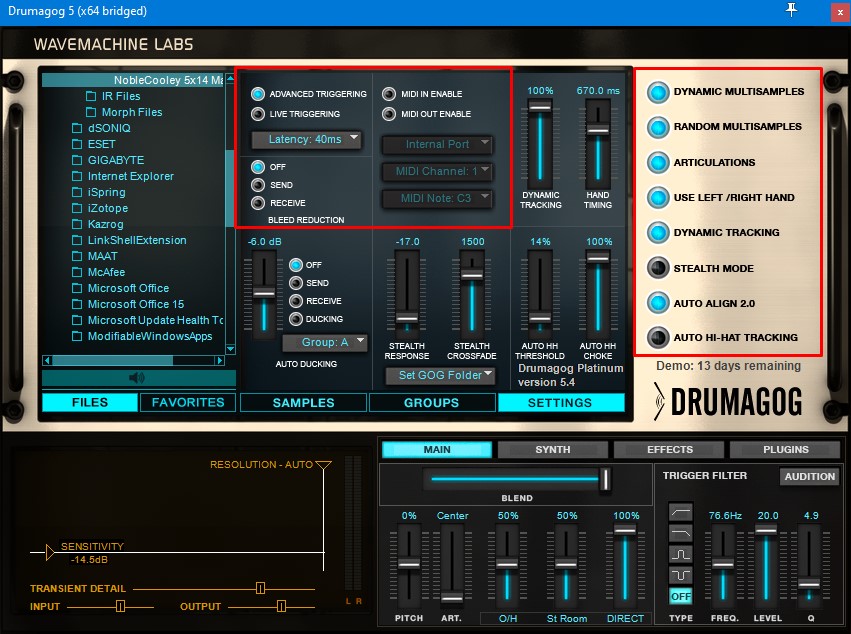 Я установил demo-версию плагина Drumagog 5 (имеются хорошие семплы, но они идут в gog.), и вот когда я открываю плагин в Reaper - плагин просто жутко виснет, еле-еле получается зайти в настройки плагина и посмотреть какую-либо информацию. Пробовал отключать доп.параметры в плагине (на скриншоте) - не помогает.