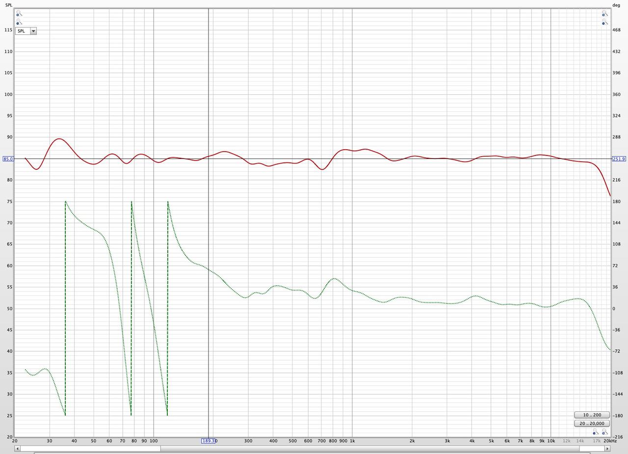 @Binaural Lee, Вам нужно сделать замер погромче, чтобы ачх была на уровне 85дб... сейчас 65. И замерьте одну колонку из точки прослушивания.