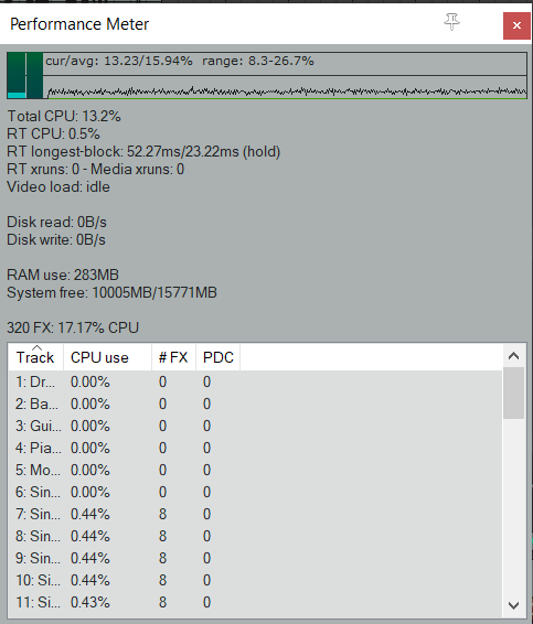 Сколько плагинов (дорожек) удалось активировать? И на каком буффере? Нужно чтобы играло без искажений длительное время.