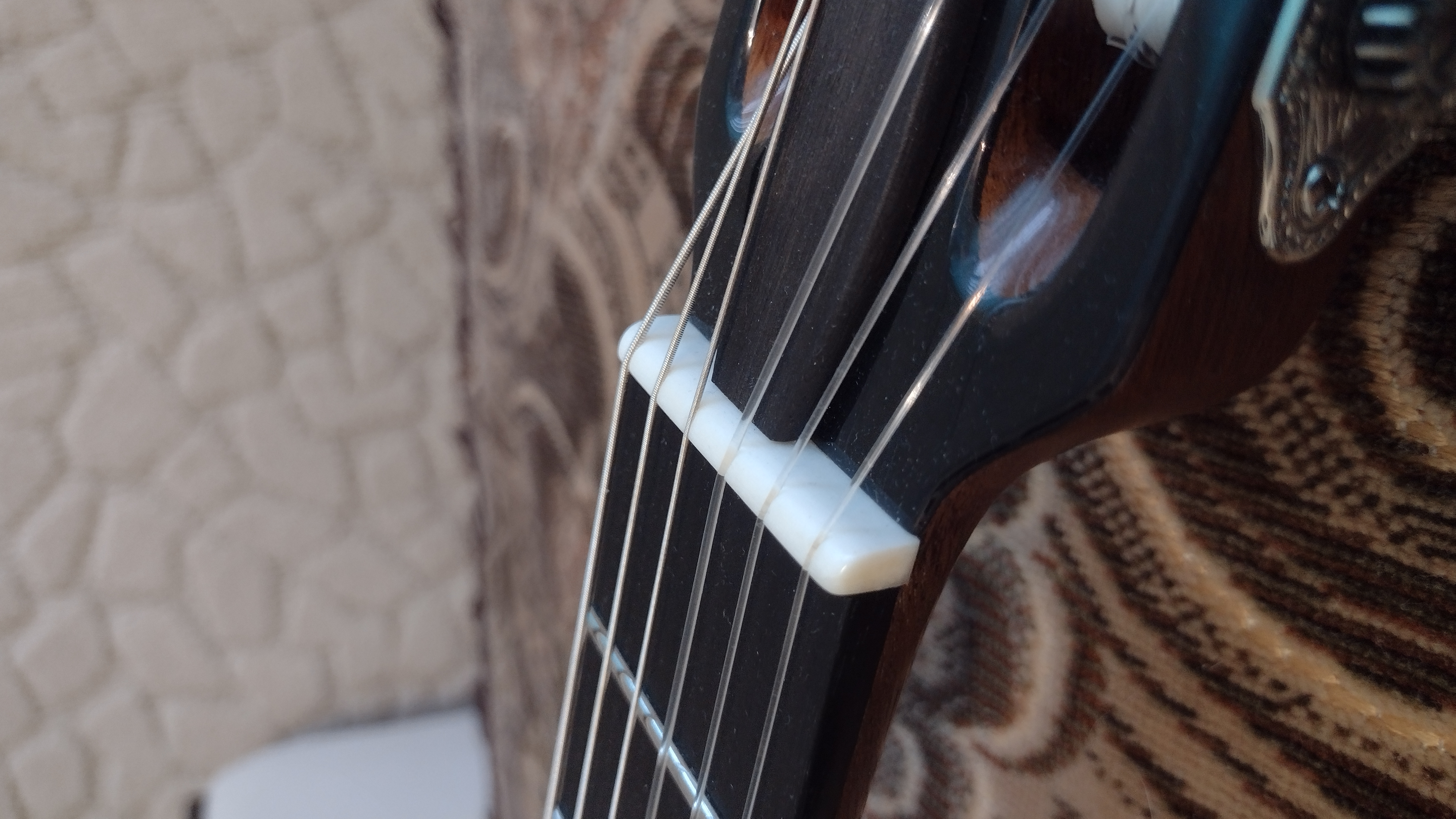 А вот снял слегка дерева в нижнем порожке (для более низкой усадки струн над грифом) и установил верхний порожек (кость) Никитос (Алтуфьево). Как видите очень недурно проработал. Молодой парень, но чуствуется перспективный. Пикчи прилагаю.