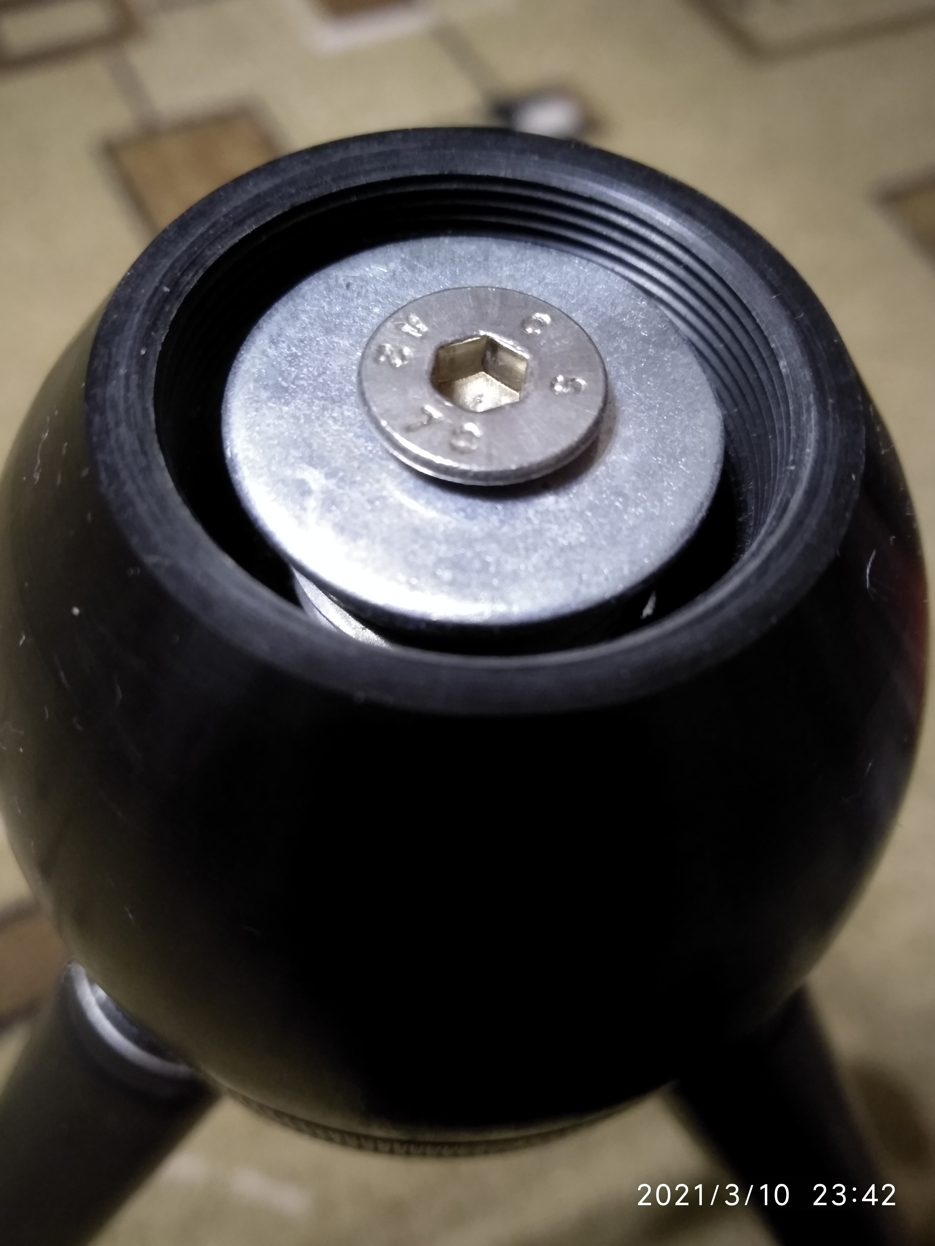 Между футорками фум-нитка 2-3 оборота на виток резьбы, между большой футоркой и пластиком трипода 1 оборот нити на виток резьбы (закручивать осторожно). Можно отболгарить лишние витки (сантехникам их нужно много) и обработать напильником срез и наружную сторону большой футорки.