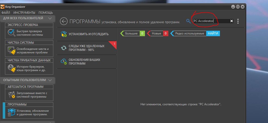 Попробовал этот Reg Organizer . По поиску тоже не находит этот PC Accelerator. Чудеса прям какие то ..