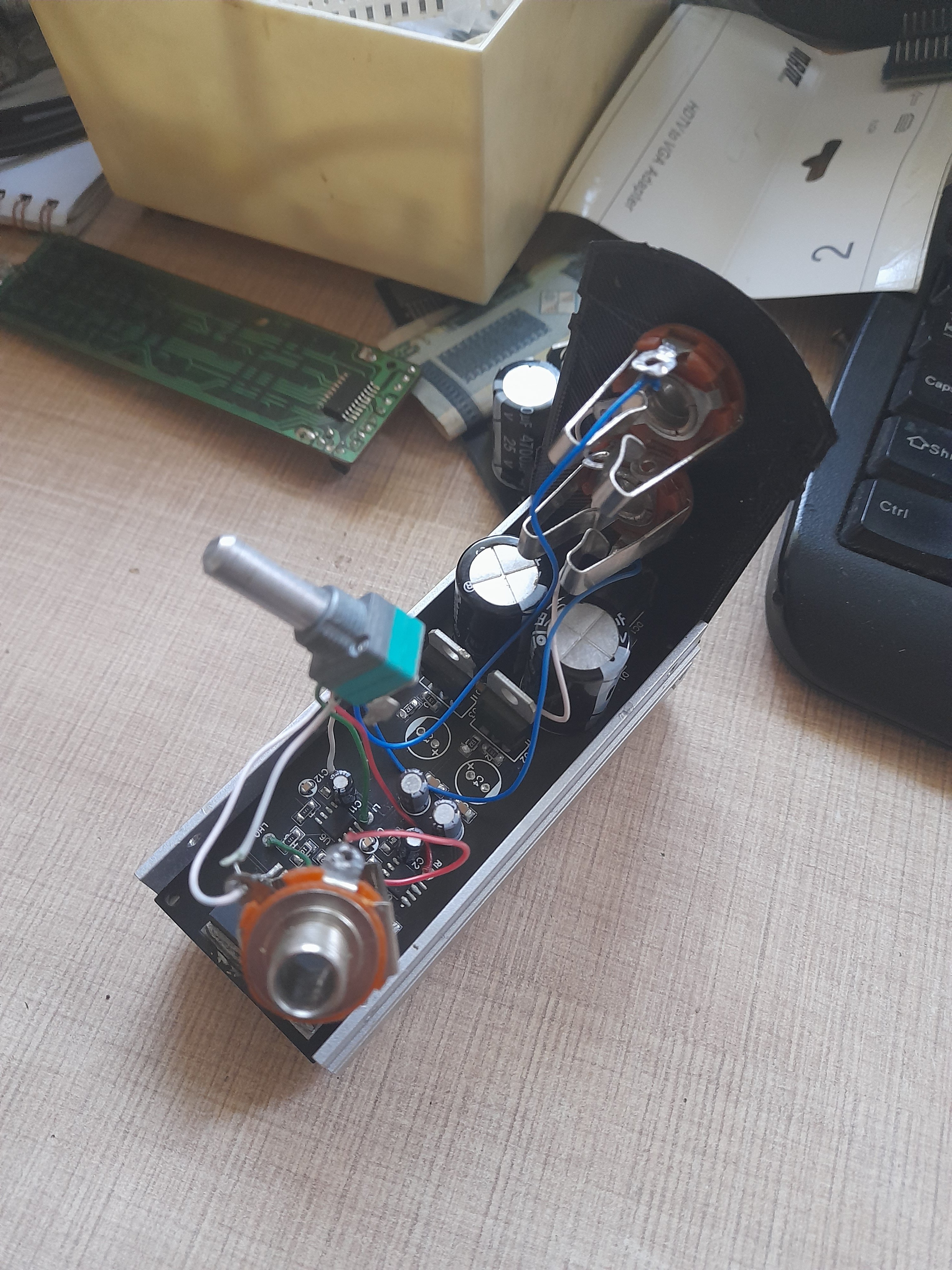 Допилили долгострой наконец. Заэкранировали все сигнальные провода, так наводки свелись к минимуму, но телефон рядом с усилителем вызывает в нем сильные шумы. Скорее всего корень проблемы в неправильной разводке земли на плате. В целом некритично, если убрать телефон подальше. Главное звучит усилок весьма прилично. Включаю что-нибудь и зависаю надолго. Сводить не пробовал, да и, предполагаю, будет проблемно - звук серединистый, есть небольшой провал низких частот, но для первого раза весьма и весьма неплохо.