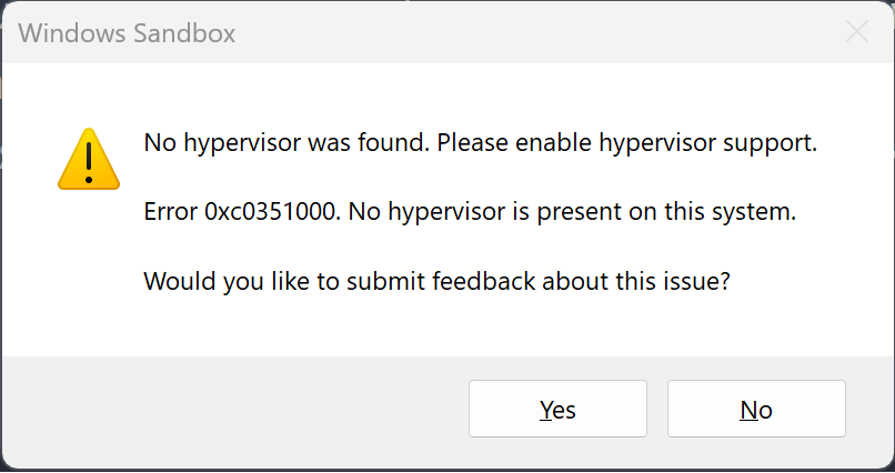 Что такое гипервизор и как его вернуть вообще? Если вы про Hyper-V, то он для запуска вроде не требуется. Sandbox запускается, если он отключен в компонентах дополнительных. Сейчас на винде 10, которую установил пару дней назад и сделал все обновления, всё работает. Чего там отваливается у винды 11 и почему фиг знает. Там в последнее время то файл эксплорер глючит, то поиск, то чего-то лишнего систему грузит с их корявыми обновами. Предполагаю, что обновление какое-то и сломало песочницу. Только инфы по этому поводу не нашел, есть какие-то жалобы отдельные в инете, без решения проблемы. А удалять все обновления и искать чего там именно все ломает, у меня лишних полжизни нет ))