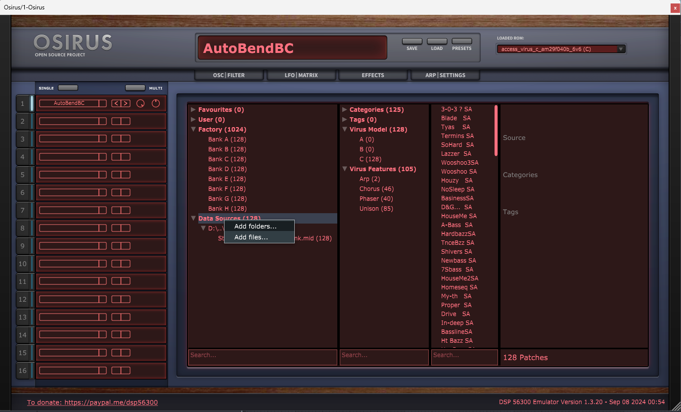 положить ром в ту же папку где и плагин лежит.Всем привет, подскажите пожалуйста как загрузить access_virus_c_am29f040b_6v6.bin в Osirus.vst3? у меня плагин открывается а звуков нет, плагин скачал с оф сайта, а что делать дальше не как не могу понять((( У меня также есть вирус повер кор, с кучей пресетов для него, и есть ли возможность их загрузить и в этот синт))) заранее спасибо большое за ответ)))