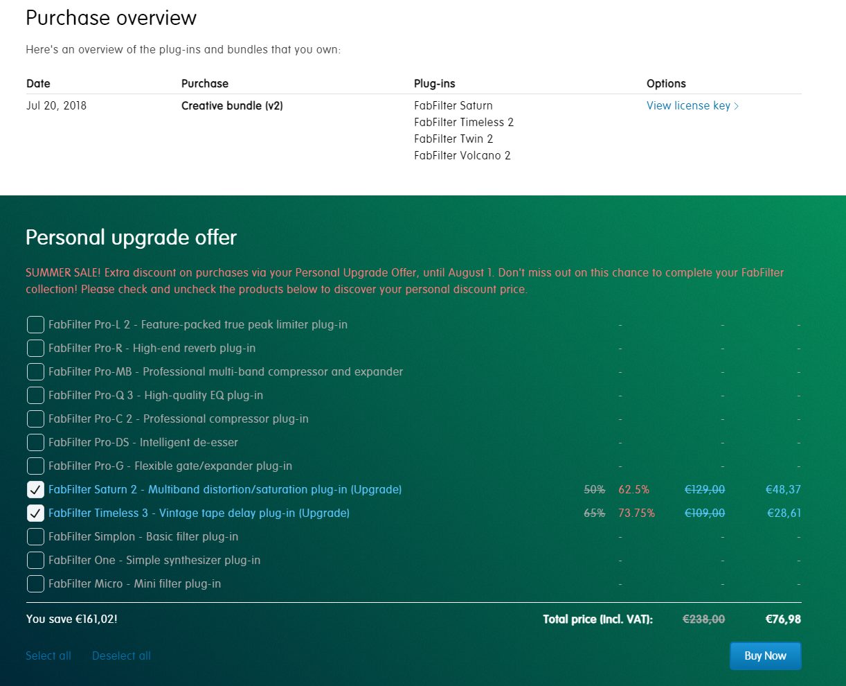 Думаю купить бандл fabfilter, но возник и вопрос: сколько стоит ежегодное обновление или как там вообще обновляется софт, может и вовсе бесплатно? Кто владеет данными плагинами отпишитесь пожалуйста. Не хочется чтобы история с вейвсами у меня повторилась, так что из-за цены ежегодных обновлений пришлось с ними расстаться.