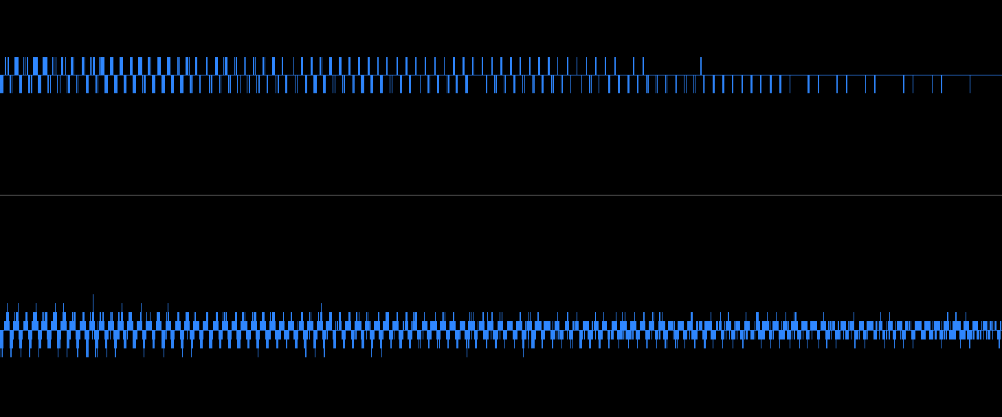 Видно, что оконцовка затухающего звука без дитеринга, сохраненного в mp3, с точки зрения психоакустической модели оказалась достойна вдвое меньшей битности, чем, когда звук был с дитерингом.
