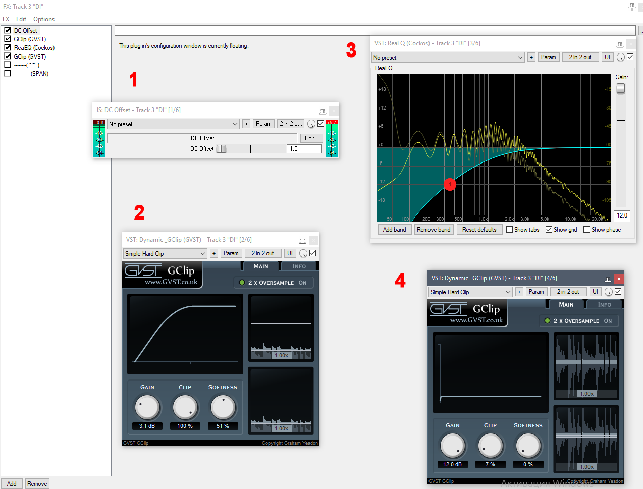 2. После него ставим клиппер, в меру мягкий и регулируем степени смещения, гейна, мягкости клиппинга.