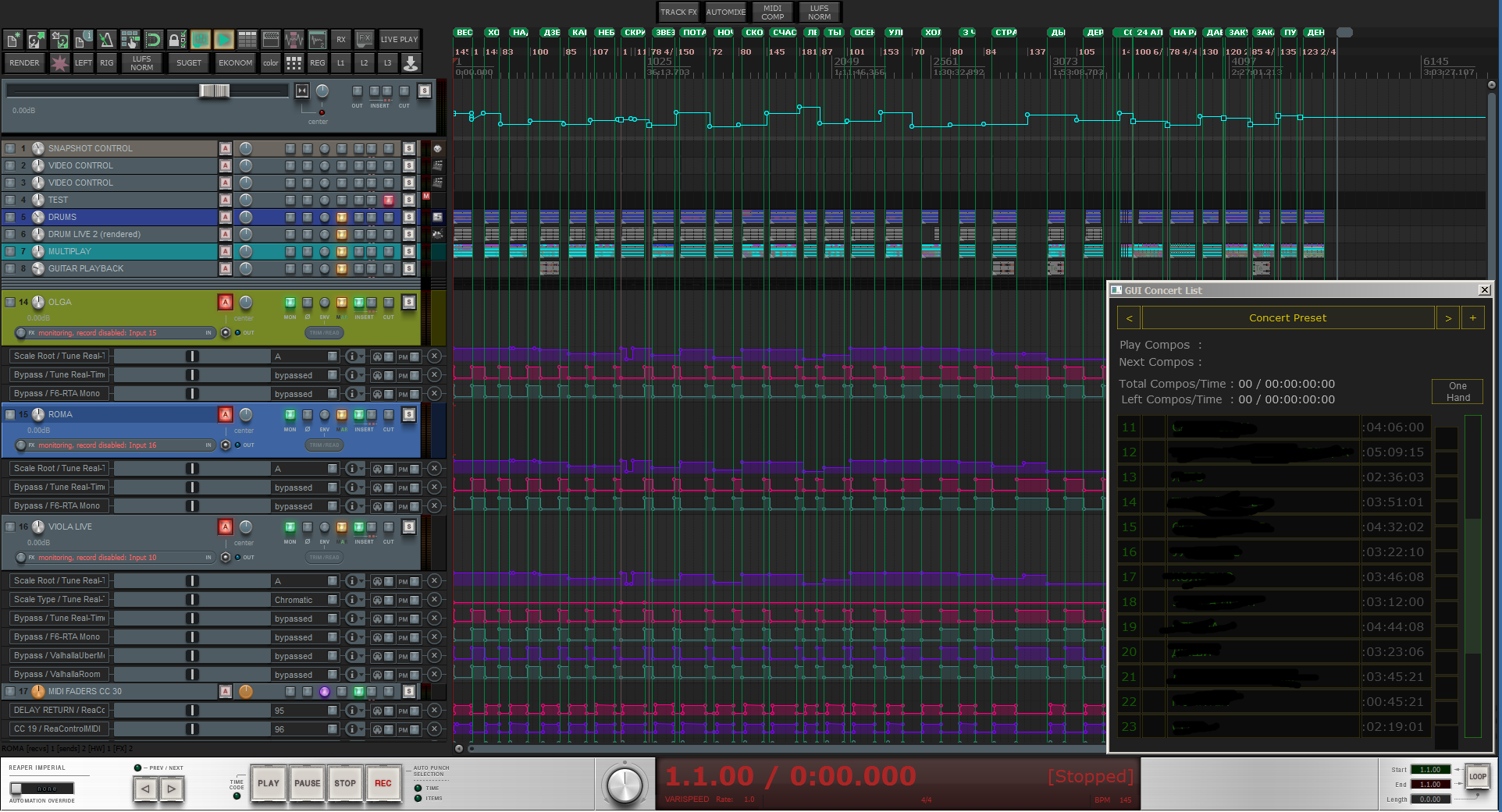 Тут появилась такая задача: есть несколько проектов в Рипере на отдельные песни для живых выступлений. В них метрономы в уши музыкантам и звуковые эффекты в зал. И есть проектор, который обычно просто отображает анимированное лого группы на заднем фоне сцены. И хотелось бы сделать для каждого проекта отдельный видеоряд, синхронизированный с музыкой. Чтобы в нужный момент что-то вспыхивало и т.п. Вопрос в том, как сделать, чтобы видео запускались одновременно с запуском проекторов по таймингу, но при этом, чтоб в проектор шло ТОЛЬКО видео. Чтобы из зала не было видно Рипер на большом экране, в момент когда включается новая песня. Просто чтоб был черный экран в это время. Песни включаются именно вручную, а не автоматом, так как длину пауз между песнями заранее предугадать нельзя, вокалист может с залом общаться или ещё чего. Проектор предполагается подключать к ноутбуку с проектами через HDMI.