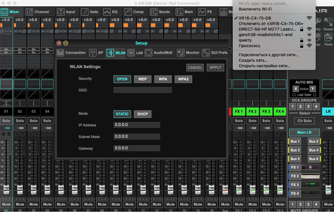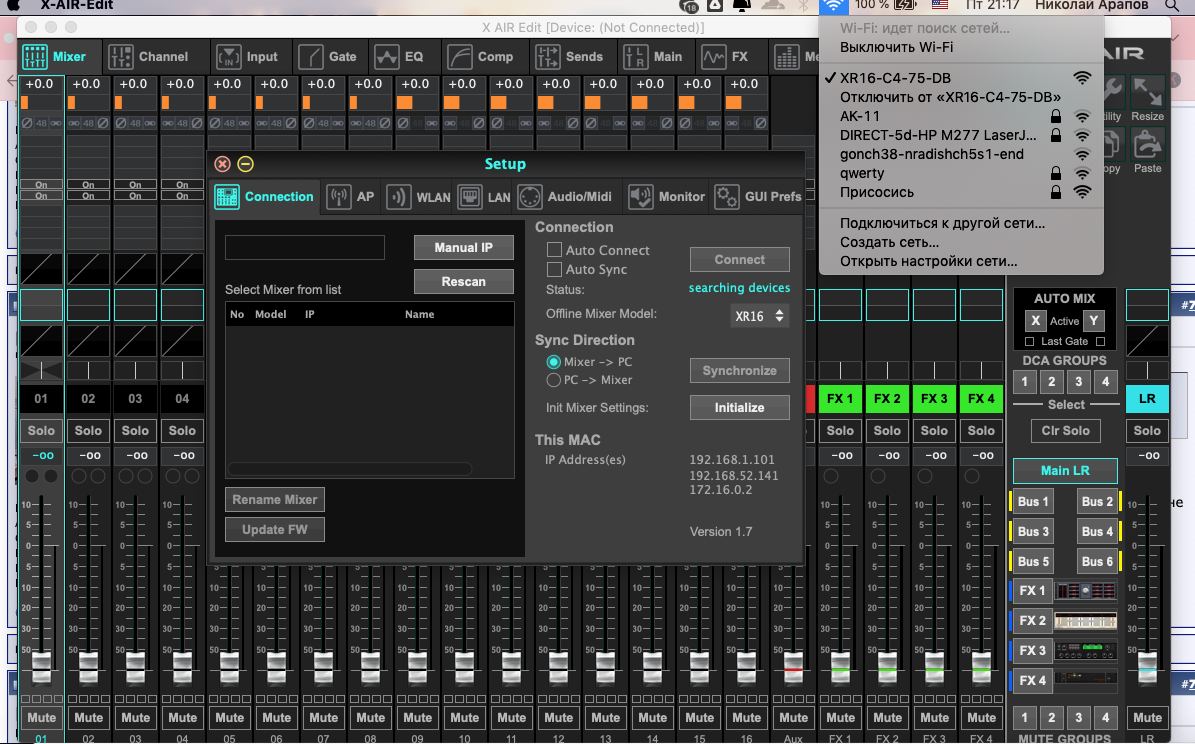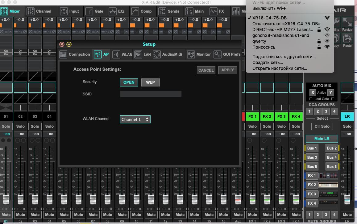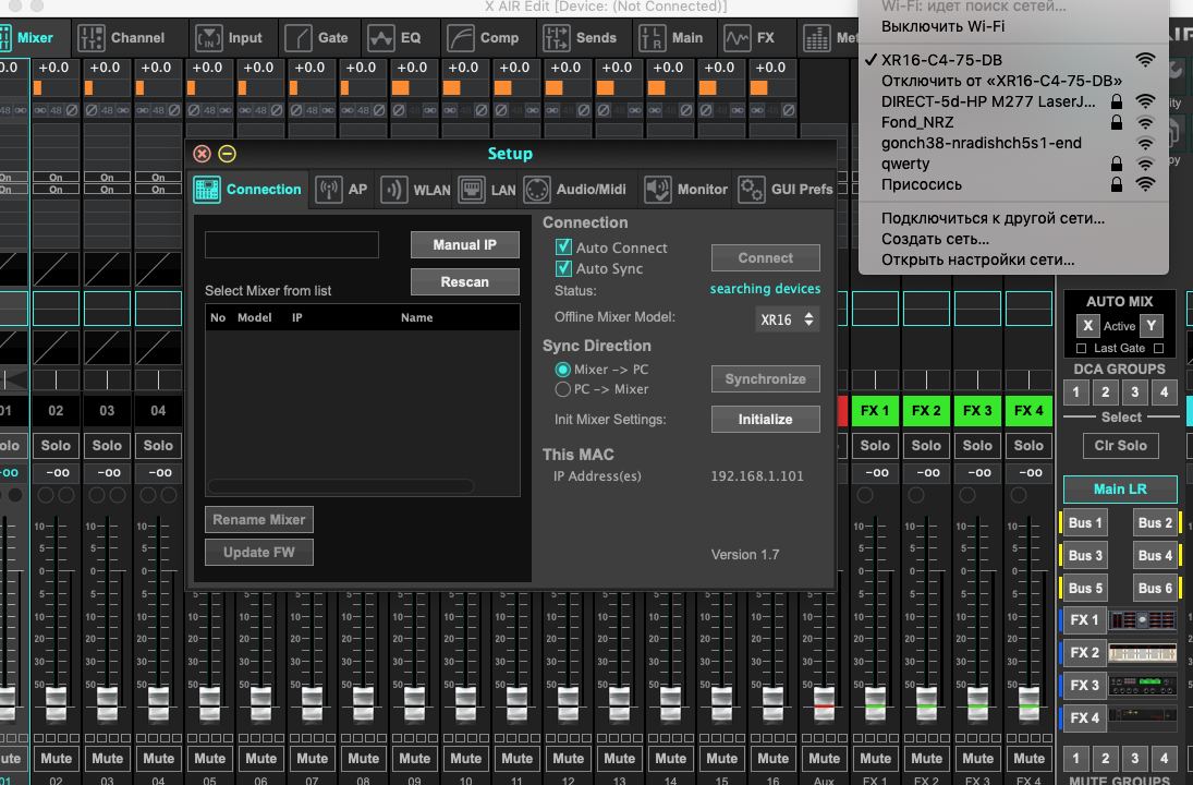 Behringer x air xr16 перестал коннектится я с маком, с телефона коннектится и все нормально. Удалял и переустонавливал программу, и ставил на мак версию ниже, не хочет видеть пульт и всё тут.
