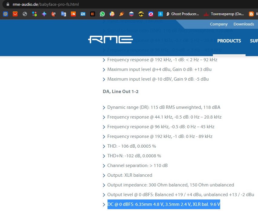 Всем доброго времени суток! Почему у RME Babyface Pro FS нет 9.6В на XLR выходах? Там есть 2 переключателя +4dBu это максимум 0.4В, а +19dBu это максимум 2В. Хотя на официальном сайте в спецификациях написано, что 9.6В. Скрин прилагаю.