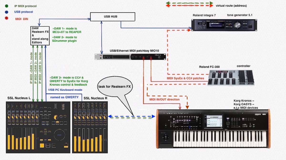 - MIDI device "SSL nucleus2" подключен через IPMIDI протокол для MCU-эмуляции панели контроллера. Плюс еще QWERTY-key эмуляция идет по USB (одним словом - Nucleus2 выполняет роль второй PC-клавиатуры на определенных кнопка)