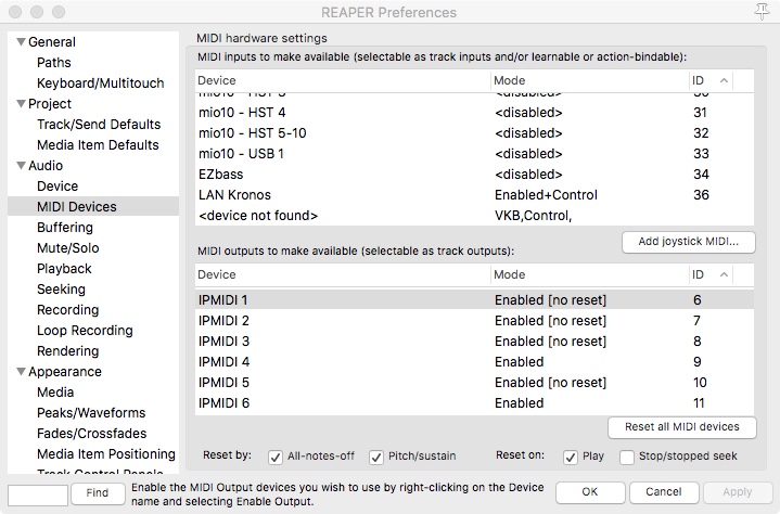 в настройках REAPER MIDI devices: