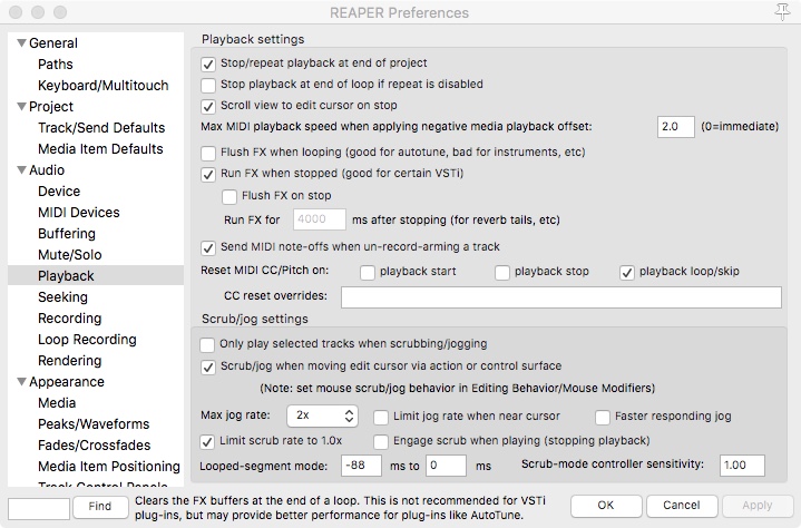 - в Playback настройках REAPER тоже попытался изменять поведение "посылать reset" при транспортных манипуляцциях для всех возможных операций с кнопками - тоже безрезультатно (да и не нажимаю я кнопки PlAY/STOP когда переключаю управление между DAW/Kronos для того что бы что-то "подкрутить" там или выбрать иной банк-preset в оборудовании).