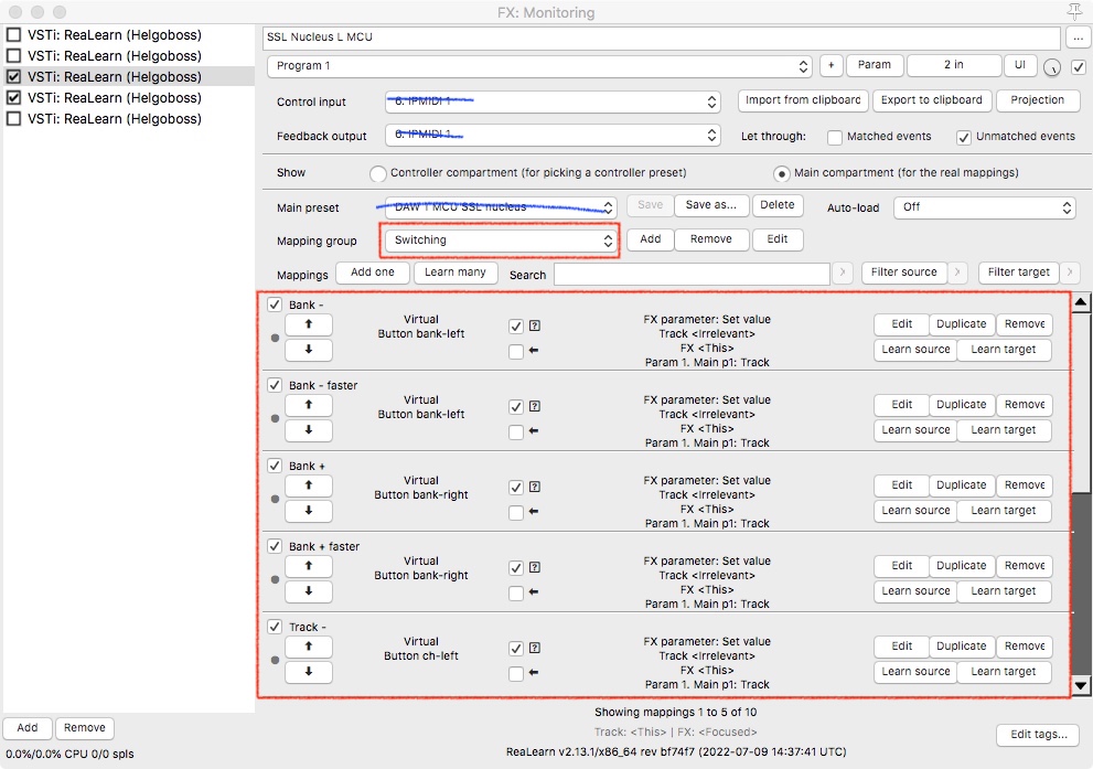 c поочередным переключением между этими двумя экземплярами Realearn FXs в опциях настройки маппинга «realearn enable/disable instance» (когда первый включен, второй выключен).