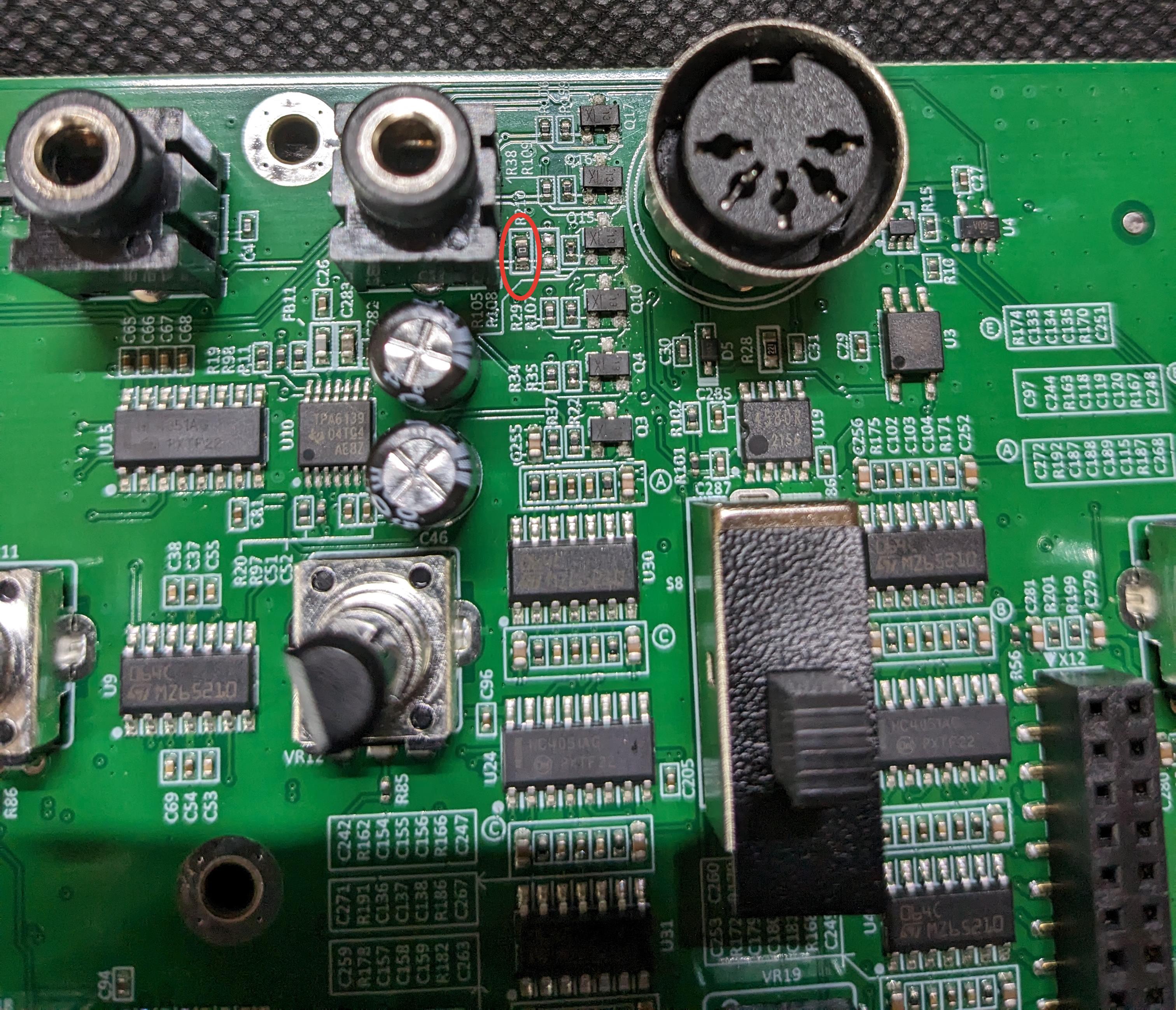 Полностью делать весь трейс линии было лениво, прозвонил все от гнезда джека до этого резистора и удалив его появился звук.