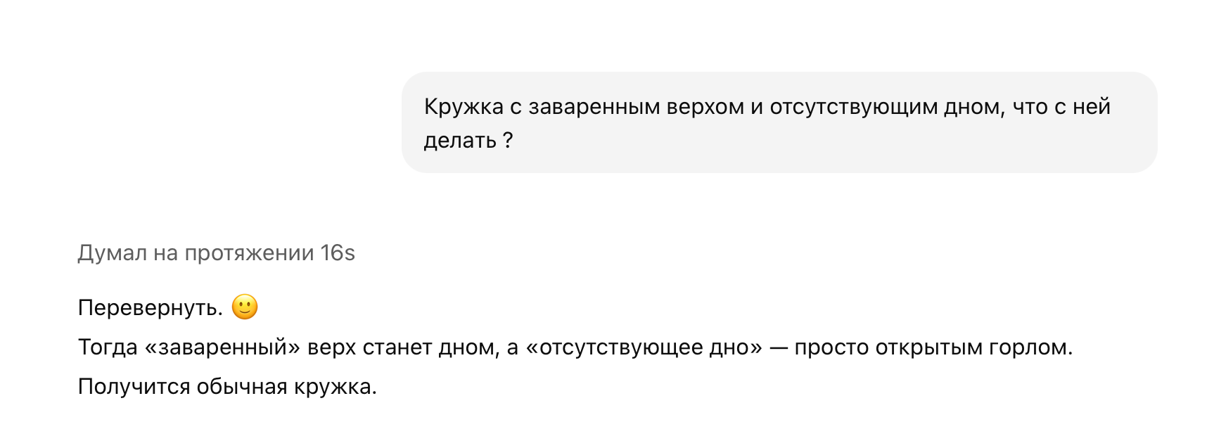 Не совсем в тему, но по теме. Сегодня развлекаюсь с Алисой, DeepSeek, ChatGPT, GigaChat. Обсуждаем что делать со странной посылкой. Кружка с заваренным верхом и отсутствующим дном. Столько различных альтернативных вариантов, но к простому варианту просто ее перевернуть так за три часа обсуждения и не пришли.