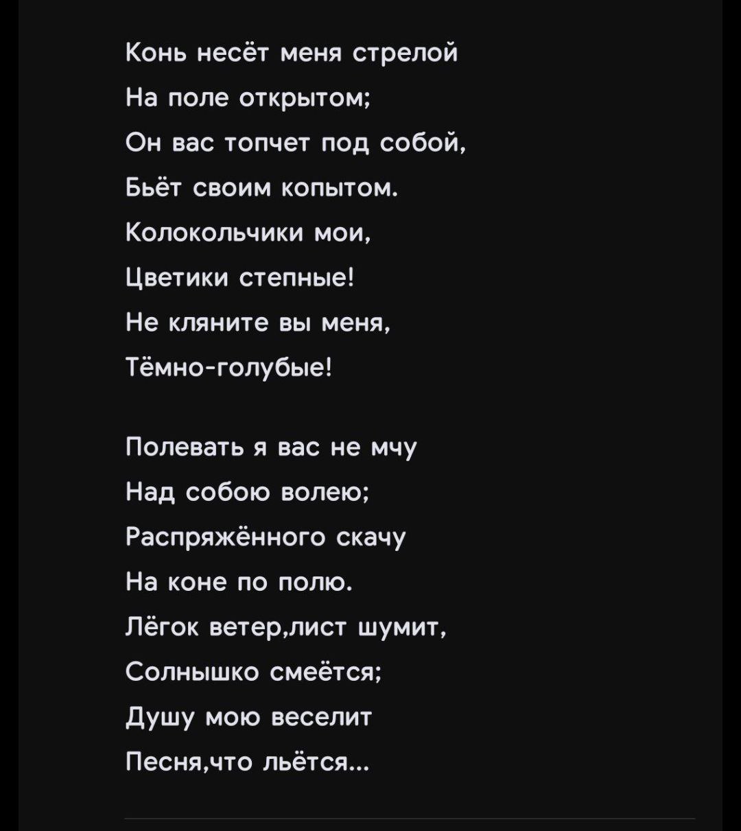 Предполагаю, что в моей базе данных текст стихотворения по ошибке был «склеен» с фрагментами других произведений Толстого (например, «Где гнутся над омутом лозы…») или с какими-то народными вариациями на его тему. Или же это был черновой, расширенный вариант, который автор в итоге отбросил, оставив лаконичные две строфы. В канонических изданиях печатается именно эта, короткая версия.