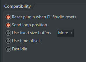 • Use fixed size buffers (использовать фиксированный размер буфера) - FL Studio распределяет данные плагинов, используя переменные размеры порций данных (буферов). Некоторые плагины требуют фиксированных размеров буферов (что находится за пределами VST стандарта, но поддерживается в FL Studio для удобства). Если обе дополнительные опции выключены (см. ниже) опция фиксированного размера буфера использует 2 мс. Недостатком является то, что фиксированный размер буферизации может ввести дополнительную задержку, в зависимости от размера звукового буфера, выбранного в настройках звука (F10). Эта задержка удваивается для плагинов эффектов. Тем не менее, в некоторых случаях этот параметр может исправить нежелательные задержки и или звуковые глюки при рендеринге, вызываемые некоторыми плагинами. Options: Эти две опции могут быть использованы только если Fixed sized buffers по умолчанию 2 мс, не работает. В общем, обе эти опции должны быть выключены.