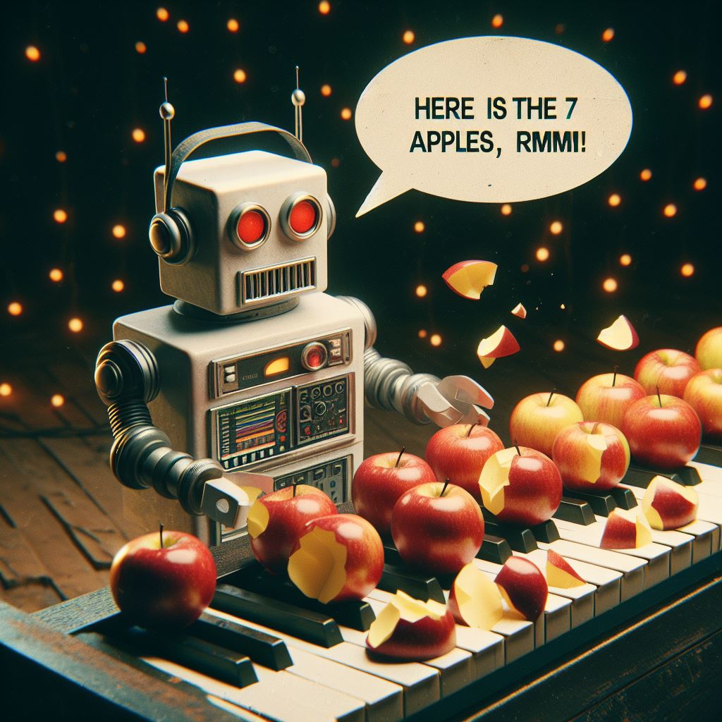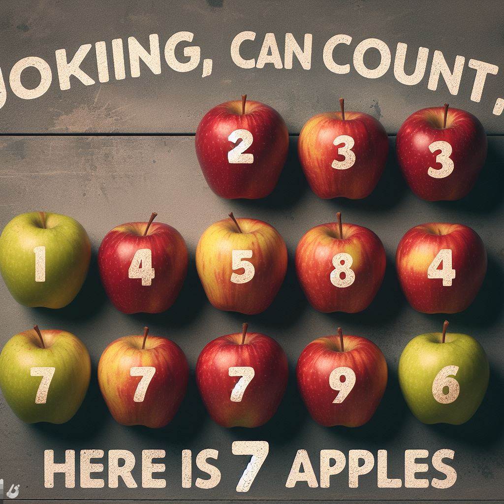 Хмм, а тут даже чувство юмора имеется)))Если есть хоть немного текста кроме 7 яблок начинается вакханалия. Бинг/DALLE-3.