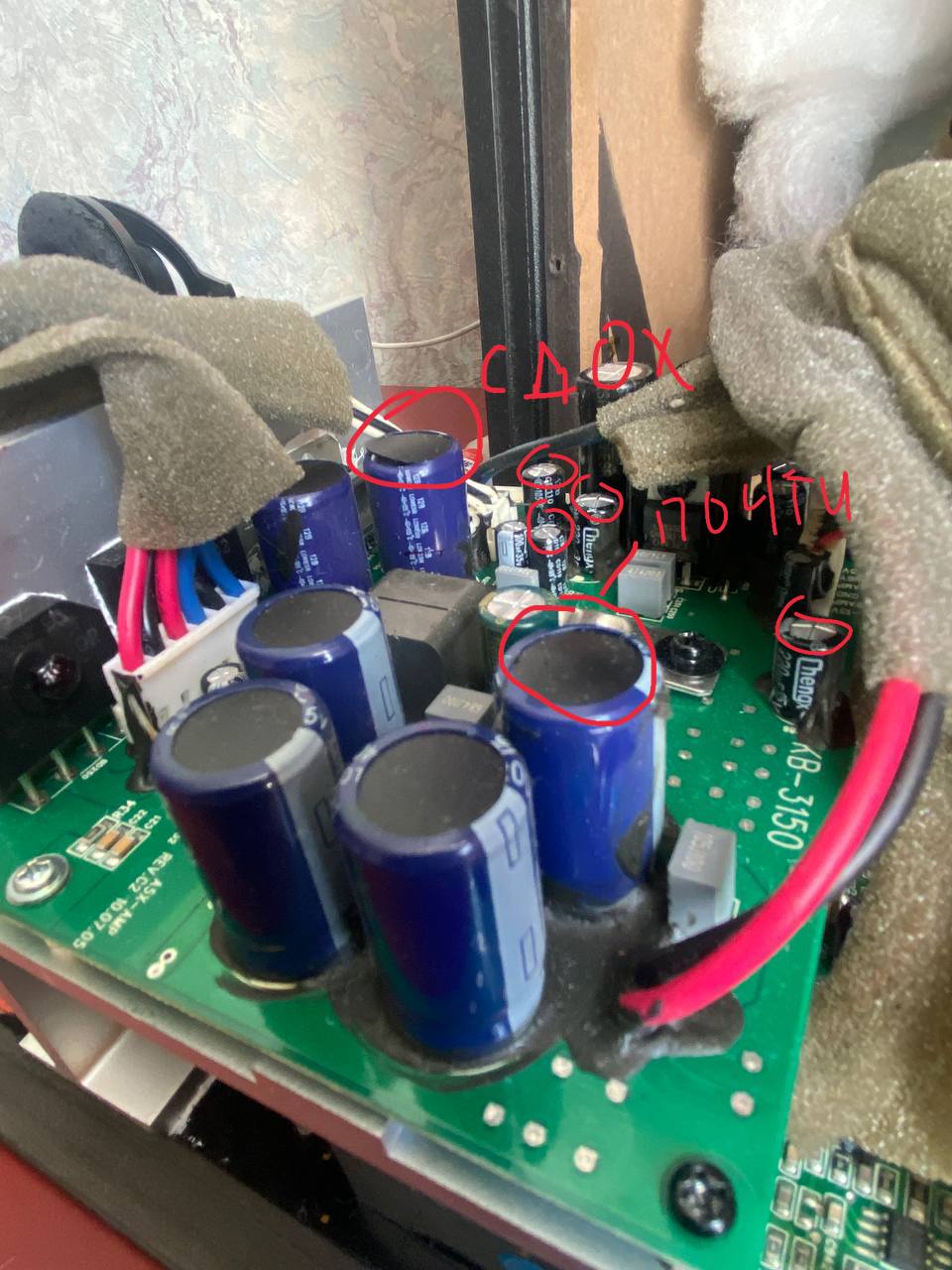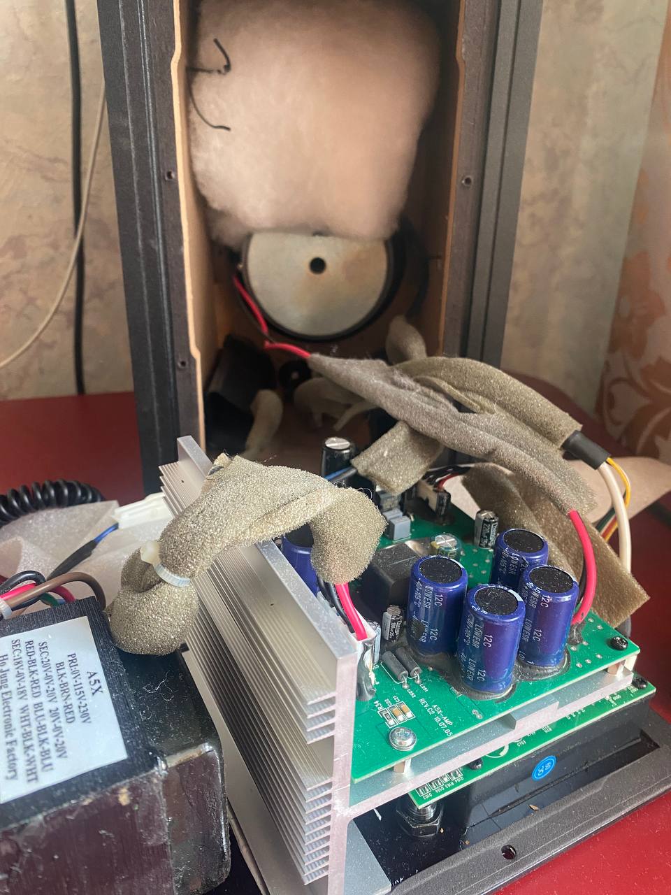 На вид кондер может быть и опухший, но все равно рабочий. А что в принципе ухудшилось со звуком? Появился гул? Что сподвигло заглянуть внутрь? Куда идут красный и черный провод справа, на плату усилителя?