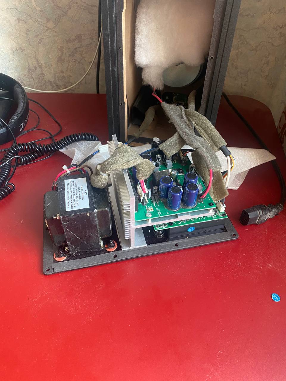 На вид кондер может быть и опухший, но все равно рабочий. А что в принципе ухудшилось со звуком? Появился гул? Что сподвигло заглянуть внутрь? Куда идут красный и черный провод справа, на плату усилителя? Я по этому фото не вижу всю картину. Там же еще платы должны быть.