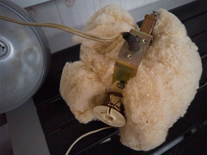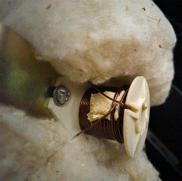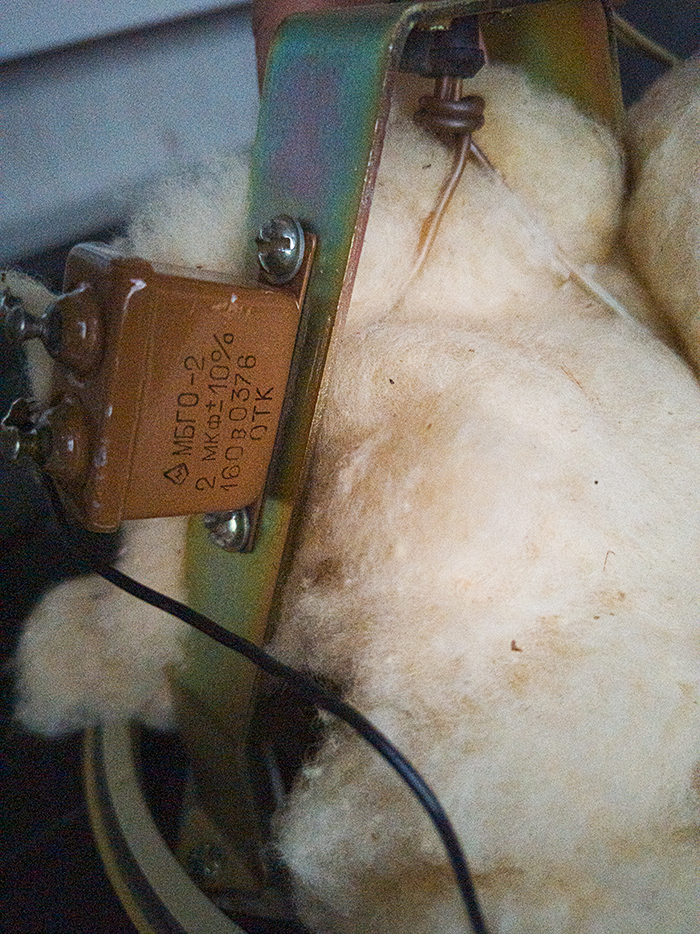 Прикладываю несколько фотографий. Внутри всё стандартно, вата, катушка, да конденсатор.