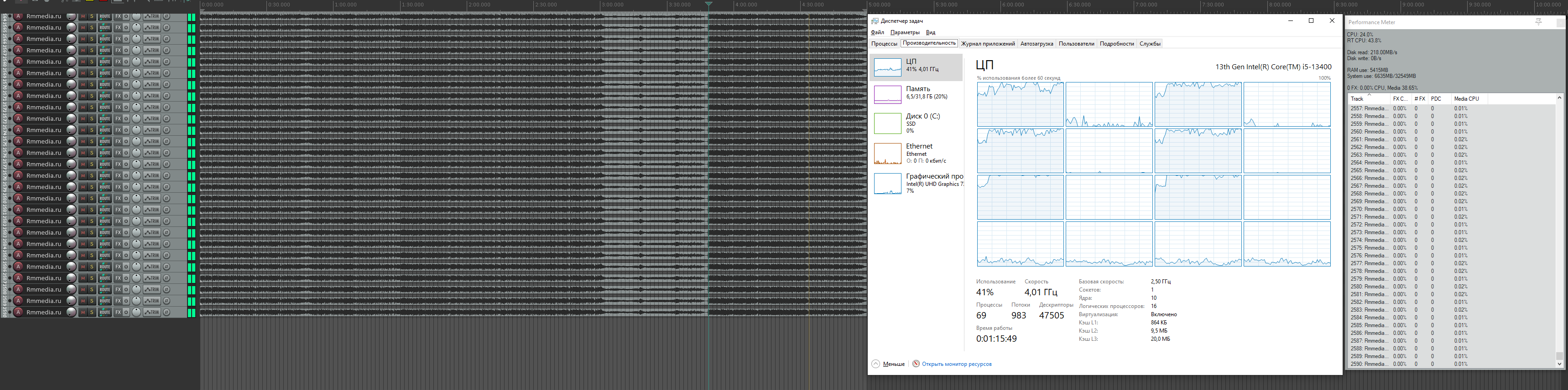 Посмотрел в диспетчере задач - все 12 ядер загружены менее чем на 50%, с оперативкой вообще непонятно, из 64 гигов RAM используются только 8%.