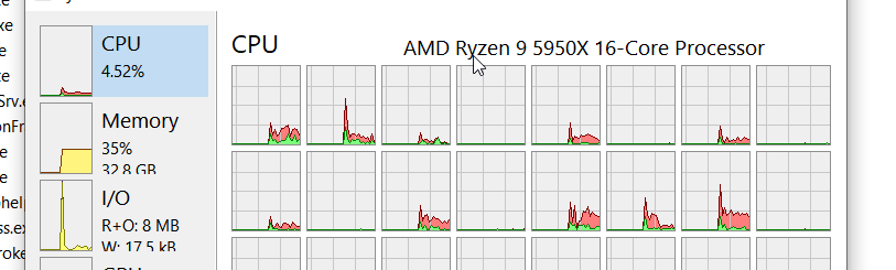 смотрим утилизацию проца - , задействовано только 2 ядра из 32 , нагрузка на проц 3.66 процента , асио метр 55