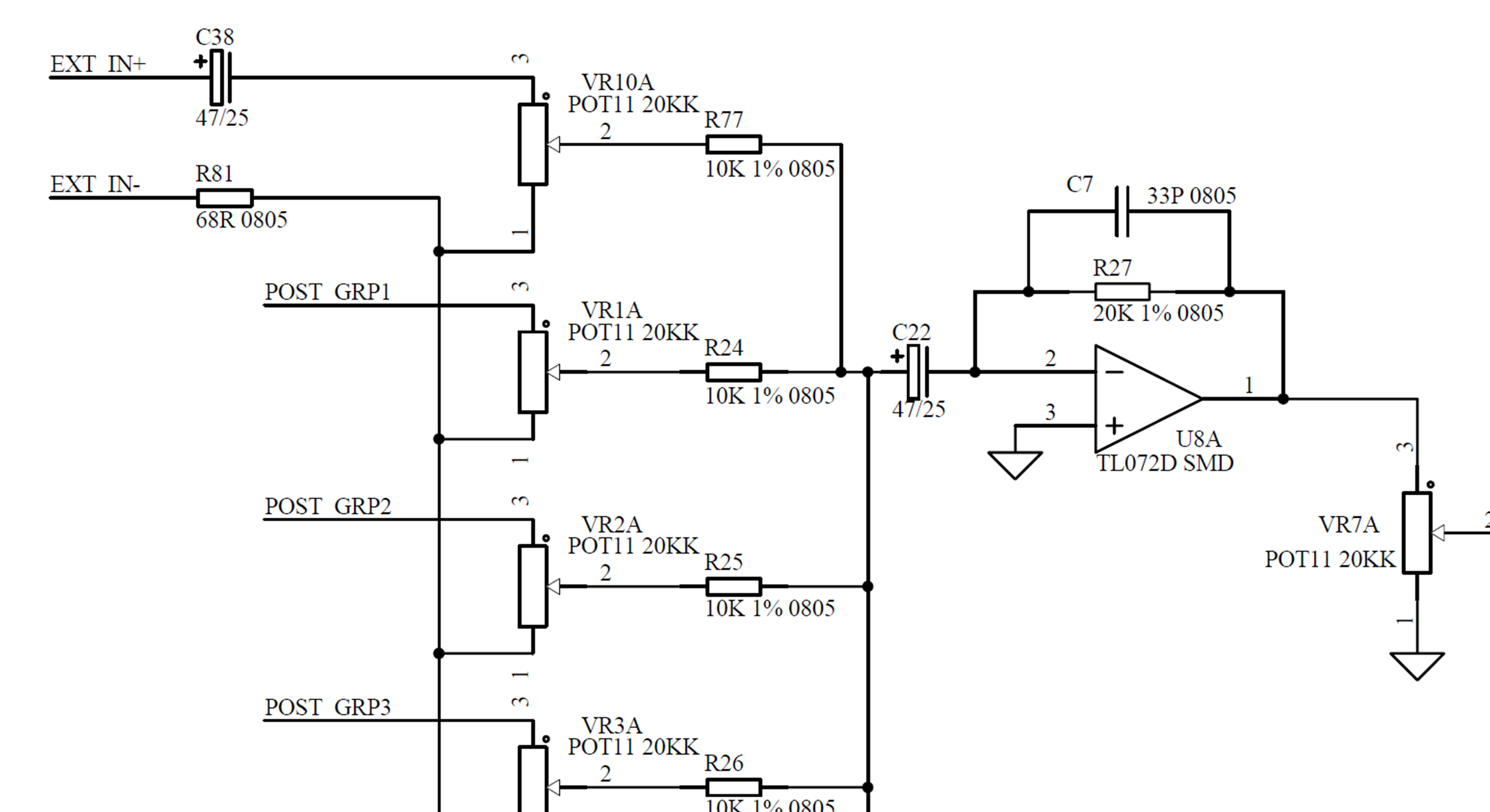 По остальным пунктам у Вас практически всё тоже плачевно, ай эм сори. Но там надо много текста писать. Впрочем... и писать-то ничего особенного не надо, просто посмотрите схемы каких-нибудь хороших пультов, там номиналы канальных резисторов и резистора в ООС - обычно это 6,8....10 кОм - совершенно не зависят от кол-ва каналов. Придумали же такое, 68 кОм (!) в цепи обратной связи при "3-х рукавах". А при 24-х сколько надо, 10 МОм что-ли?