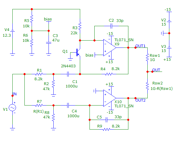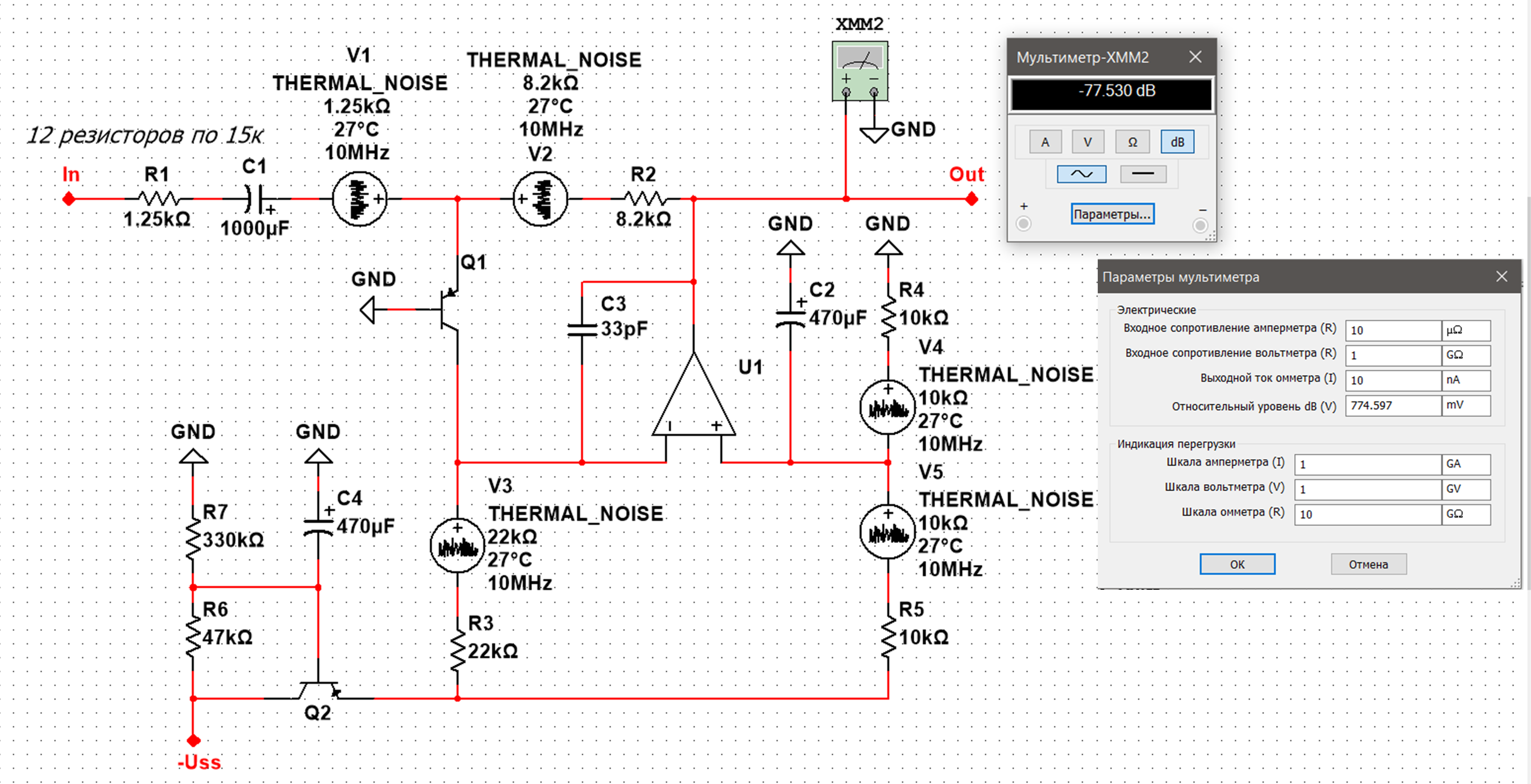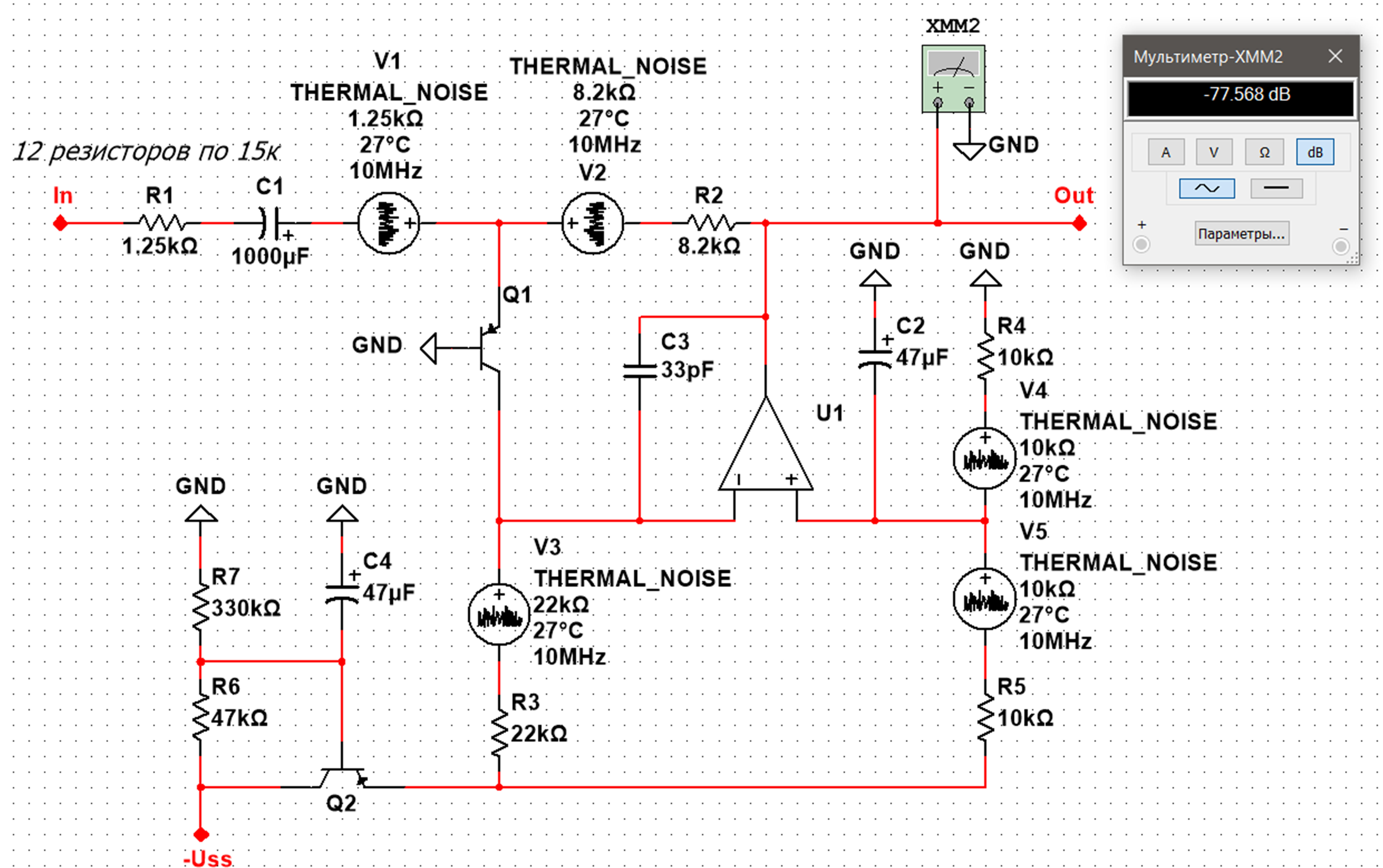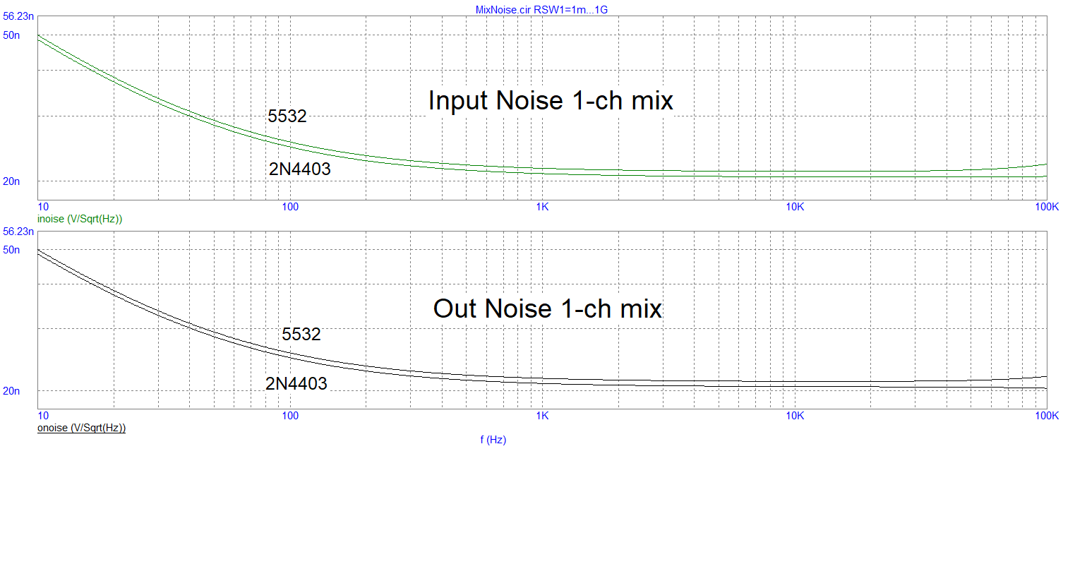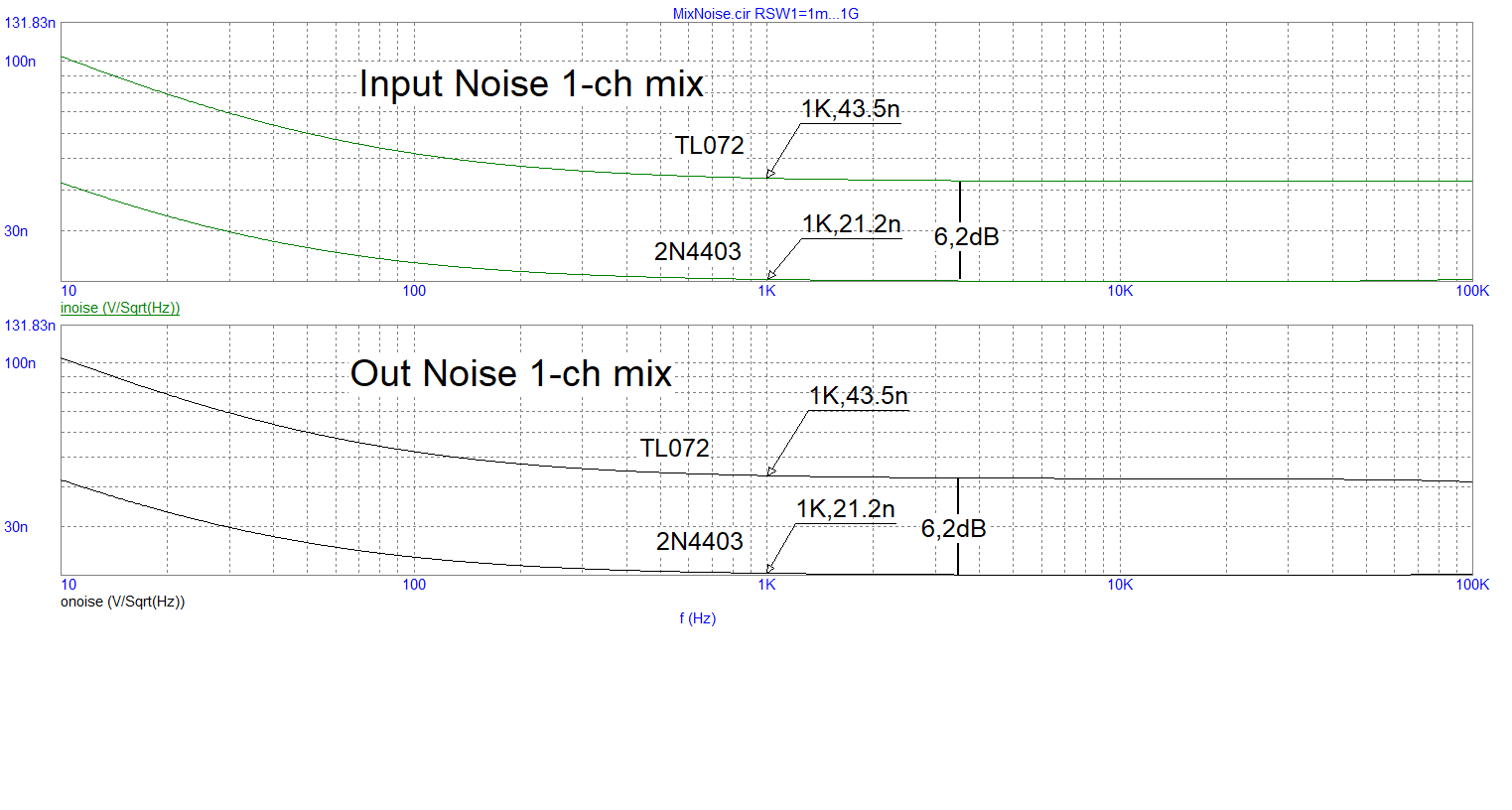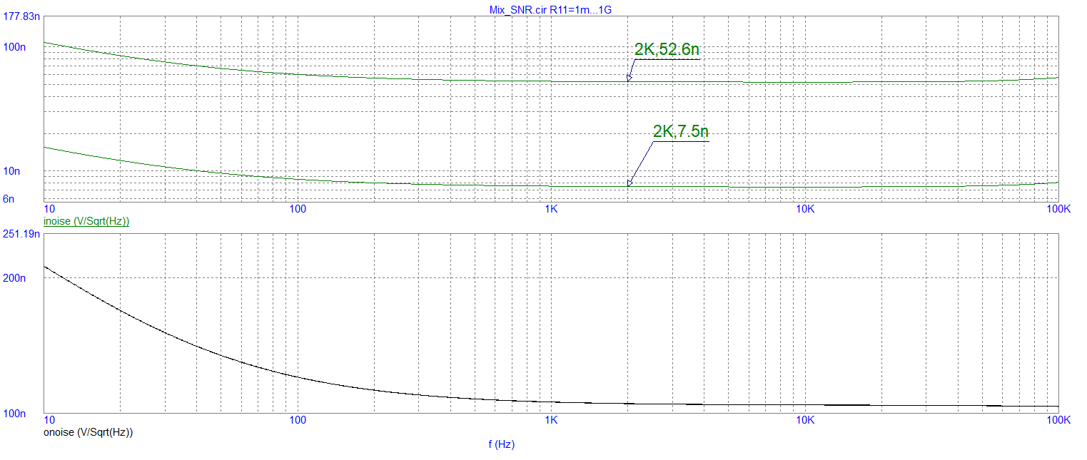 2) При сравнении схем с транзистором/без него Вы допустили две ошибки. Во-первых, надо симулировать схемы не на идеальных компонентах, а на реальных. А так - это просто симуляция пресловутого коня в вакууме, т.к. учитываются только шумы резисторов. В том-то и фокус таких схем, что добавив к дешёвому ОУ, вроде TL072 с его шумом 18 нВ/^Гц дешёвый же транзистор, вроде 2N4403, получим привед. ко входу шум 1...1.5 нВ/^Гц, как у дорогих ОУ, а линейность иногда даже лучше. И это хорошо будет видно в симуляторе.