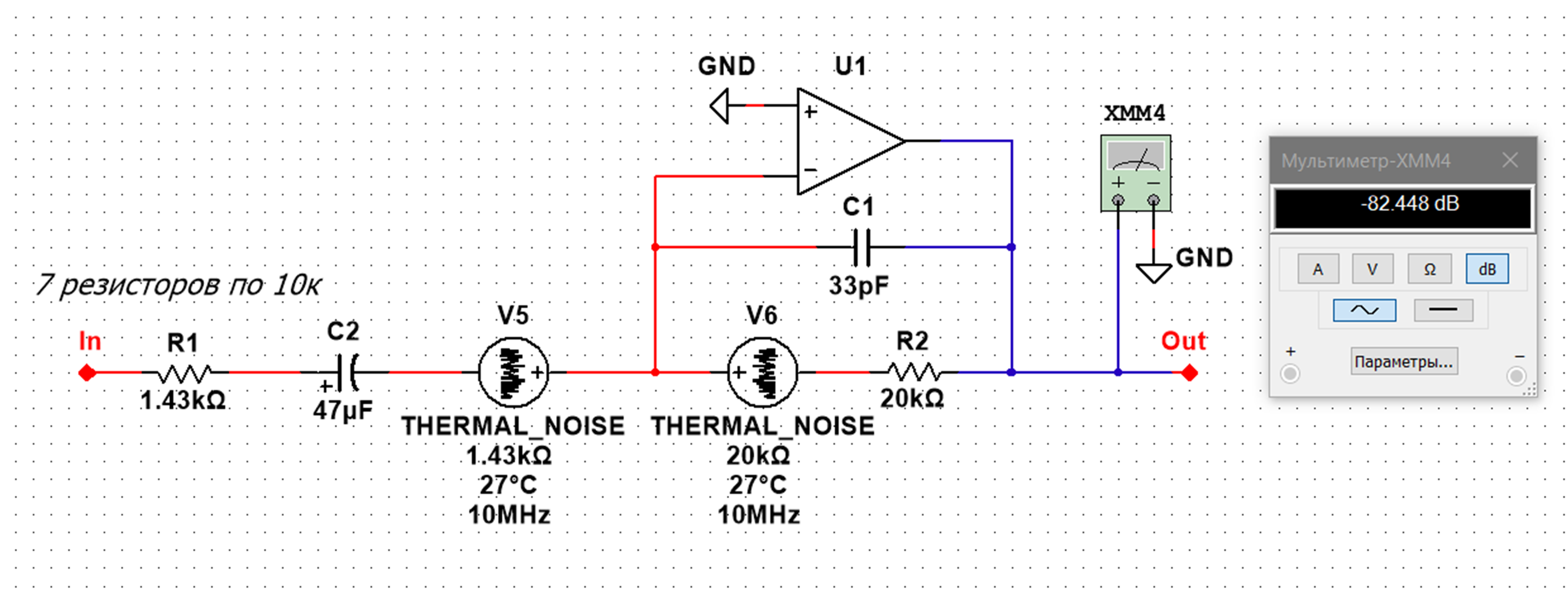 1) Ваша симуляция ошибочна, мягко говоря. Вы запараллелили 7 резисторов в точку In, относительно которой и меряется С/Ш. В этом случае Кус = 20/20 = 1. Но ведь, в реальном случае Кус для каждого входа равен 20 кОм/140кОм = 0,14. Правильно будет так: запараллелить 6 резисторов и посадить их на землю. А на 7-й резистор подавать сигнал. В результате, схема будет усиливать шум с Кус = 1, а сигнал каждого из входов - только в 0,14 раза, как это и происходит в реальной схеме. И это, естественно, ухудшит Вашу радужную картину по С/Ш.