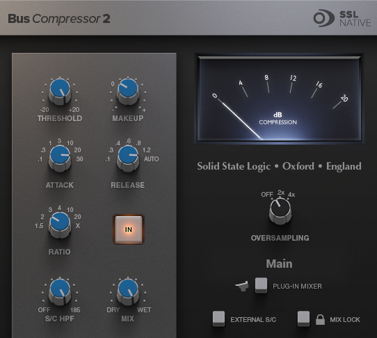 ratio 1:2, длинная атака 30, короткий или Auto релиз, отфильтровать низ, настроить Threshold лёгкую компрессию 1-1,5dB , можно Makeup 1dB .