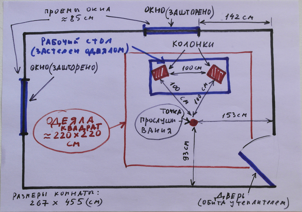 В самой комнате под потолком подвешено одеяло (расстояние от потолка до одеяла 15 см). Размеры одеяла - 120 на 220 см. Одеяло занимает лишь правую часть квадрата из одеял. Я мог бы завесить весь этот квадрат большим одеялом, но в левой части его под потолком подвешена люстра. Впрочем, при желании люстру можно перевесить, чтобы весь потолок квадрата из одеял завесить одеялом.