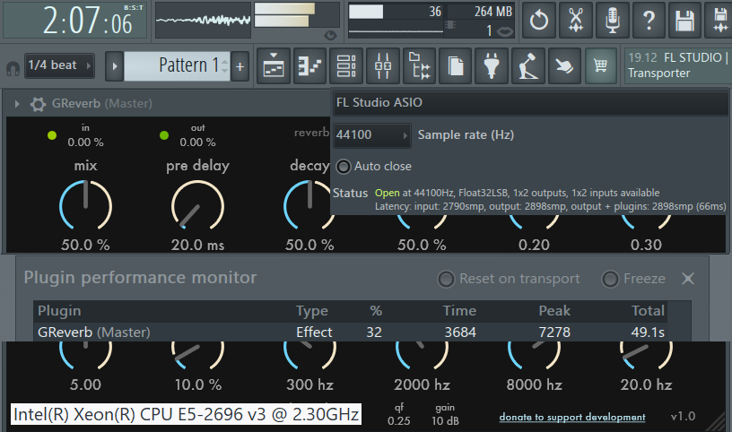 FL (лицензия, последняя версия) - вообще нет реверберации. Выкрученная в 100% ручка mix отключает звук. При закрытии-открытии окна плагина не сохраняется настроенный размер.