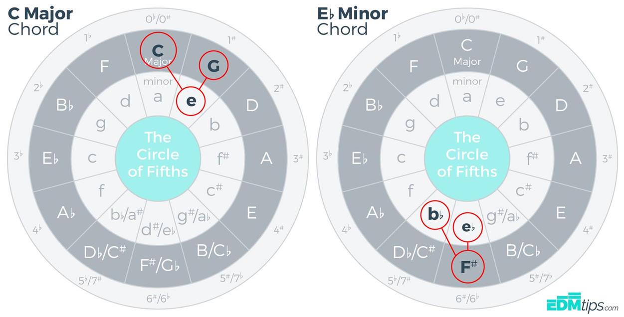 (закрашены основные аккорды в тональностях до-мажор и до-минор )