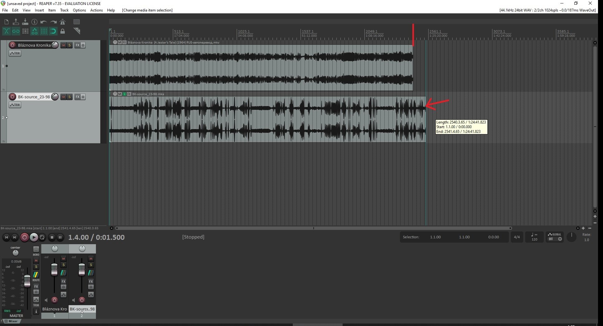Что делал: установил прогу, закинул в нее видеофайл, закинул рядом аудиодорогу (нижняя полоска) на прикрепленном скрине. На скрине видно, что аудиодорога длиннее видео. Как гармошку, зажав Alt, сжал аудиодорогу до размера видео (верхняя полоса). Точно-точно совместить не получилось, курсор при сжатии никак не хочет становиться вровень в видеодорогой. Но, допустим огреха не велика. Далее, я удалил верхню дорожку (видео), в итоге осталась только сжатая аудиодорога, потом экспорт через ctrl-alr-R в формат WAV 16 бит 48000 килогерц. В результате получился аудиофайл формата WAV почти нужной длины, но аж более чем на 900 МБ, что конечно великовато для аудиодороги. Далее, используя MKVToolNix GUI, я прикрутил новополученную аудиодорогу к видео без русской озвучки. Результат см. выше, звук стал искаженным, невоспринимаемым.