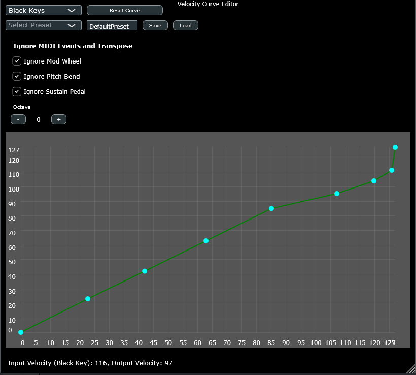 который позволяет независимо настраивать кривые велосити для черных и белых клавиш, обеспечивая коррекцию динамики для игры на миди клавиатуре в DAW.