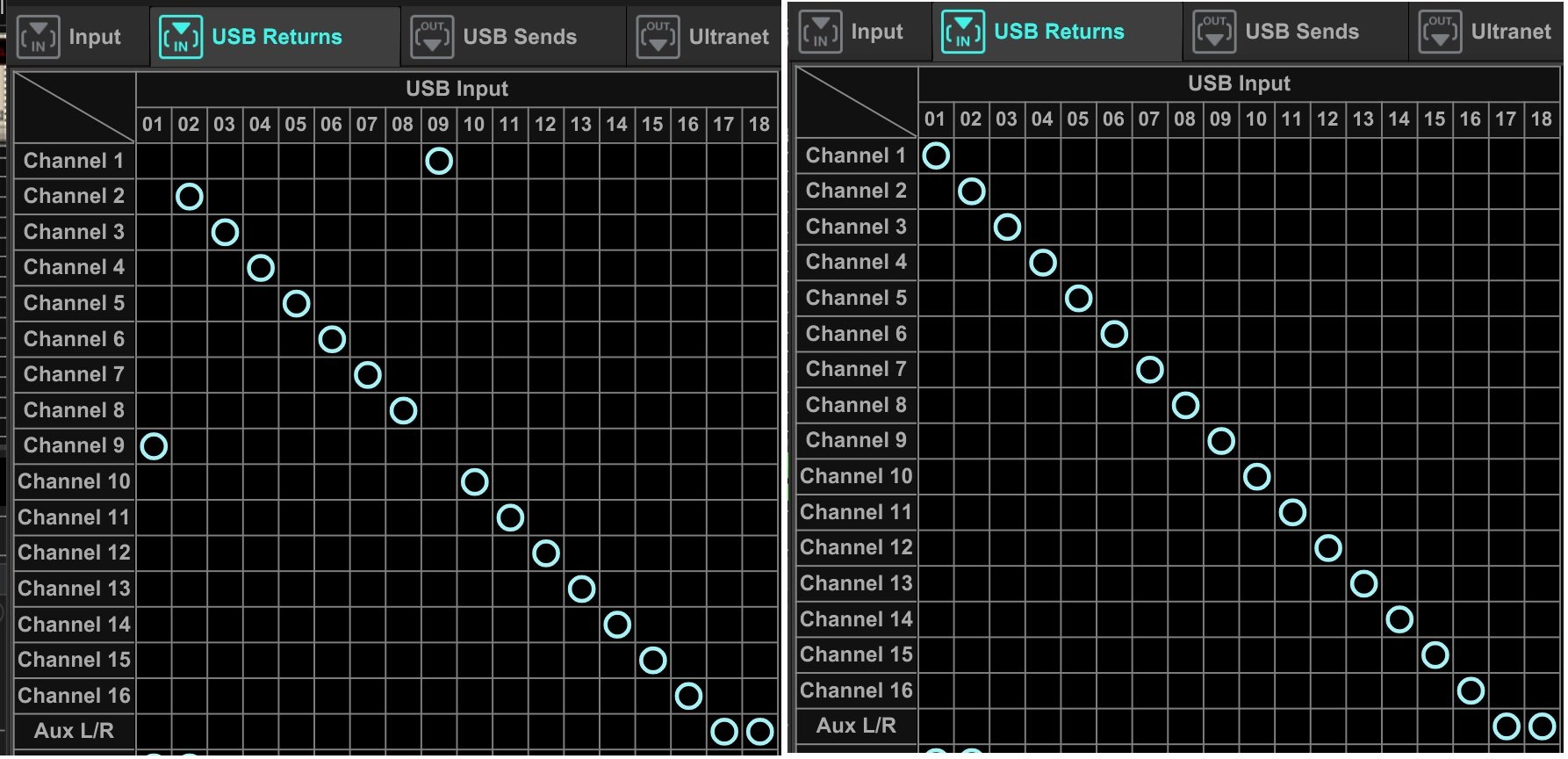 @peter28, первая картинка отличается просто потому, что я воткнул микрофон в первый вход, а возвращаю по USB мастер тоже на 1 (и 2). Вот я и поменял местами 1 и 9 возвраты, можно было бы сразу воткнуть микрофон в другой вход, и не пришлось бы перенастраивать.