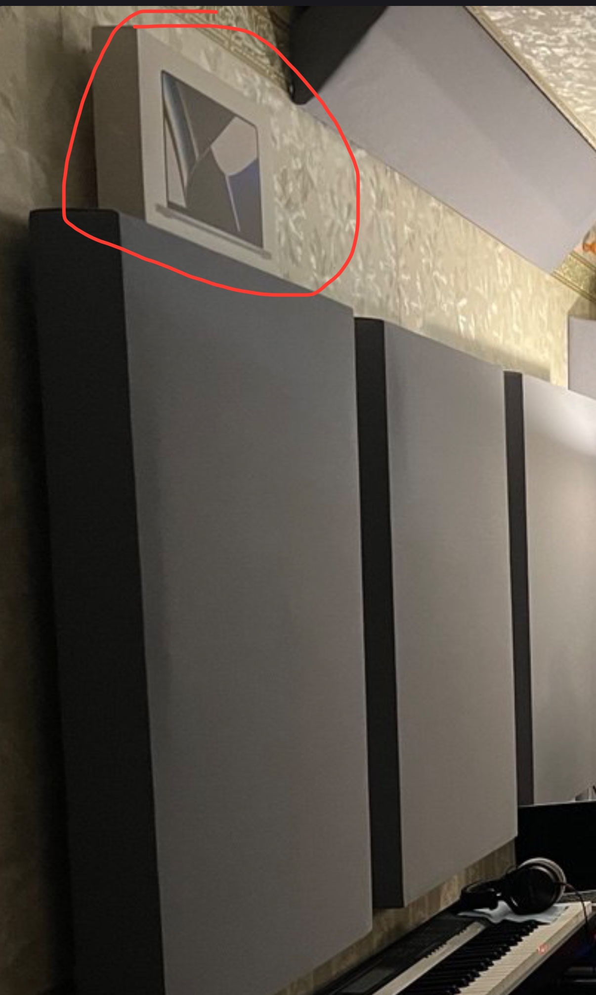 У меня аналогичная комната, все хорошо мониторится и работает, на стенах по краям с каждой стороны по 3 панели 100мм Роквул акустик батс, углы до потолка тоже заделаны и над головой облако висит тоже 100мм