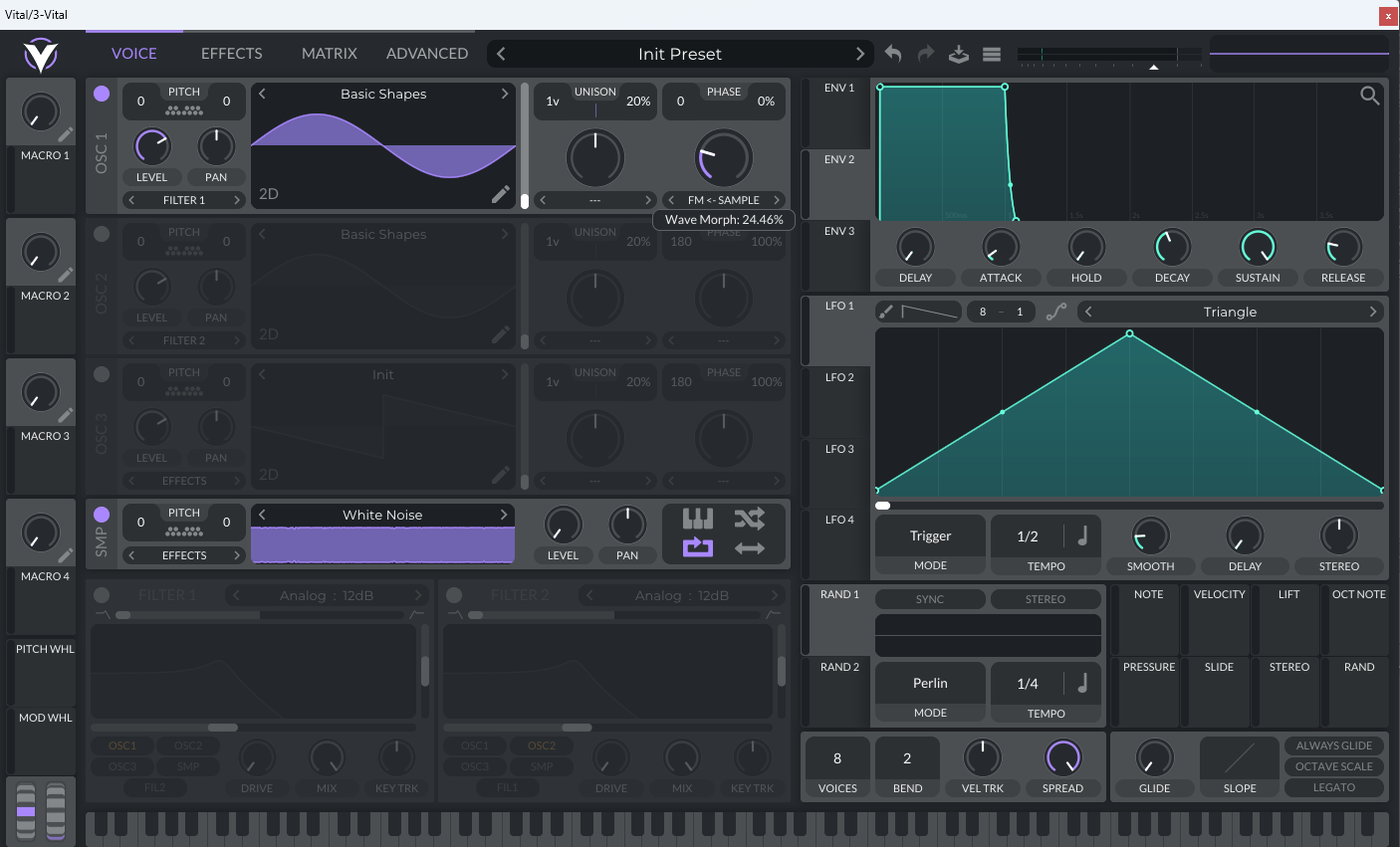 Если в Вайтал проFM-модулировать обычную синусоиду от SMP-осциллятора с белым шумом (убавив до нуля его громкость, конечно же) и крутить ручку Wave Morph, то звук будет изменяться не так, как если то же самое сделать в Серуме и крутить ручку A Warp: в Вайтале как будто просто добавляется громкость белого шума, то есть звук всегда яркий, только либо тише, либо громче, а в Серуме при кручении ручки тембр меняется совсем по-другому, отдалённо напоминая кручение CutOff.
