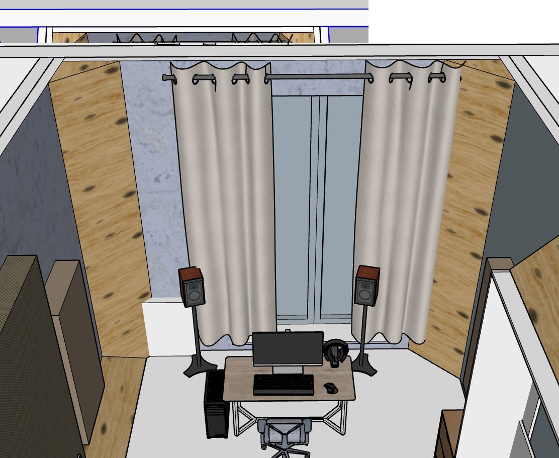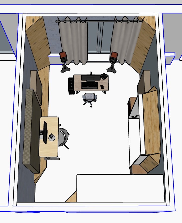Стол для контроля планирую ставить напротив окна, в углы суперчанки (треугольники 400х400 мм па катетам) зашитые фибролитовой панелью типа Heradesign (они же SoundBoard или Nordeco). Над столом облако из минваты толщиной 150 мм, на боковые места ранних отражений широкополосная панель из минваты 50 мм, mlv-мембрана и зашивка панелью Heradesign. На пол ковролин. За спиной, напротив бытовой шкаф-купе, дверки думаю заклеить войлочными панелями.